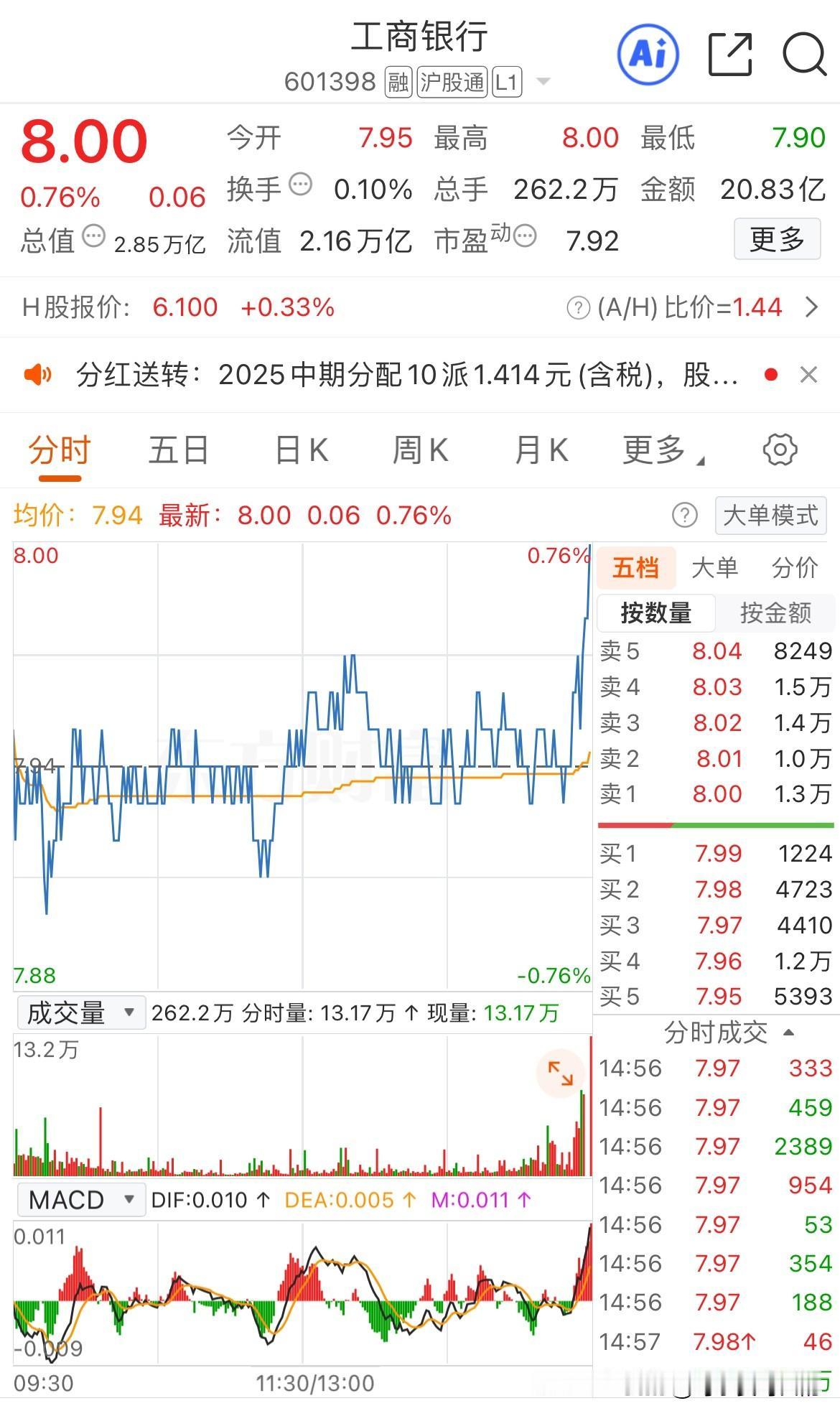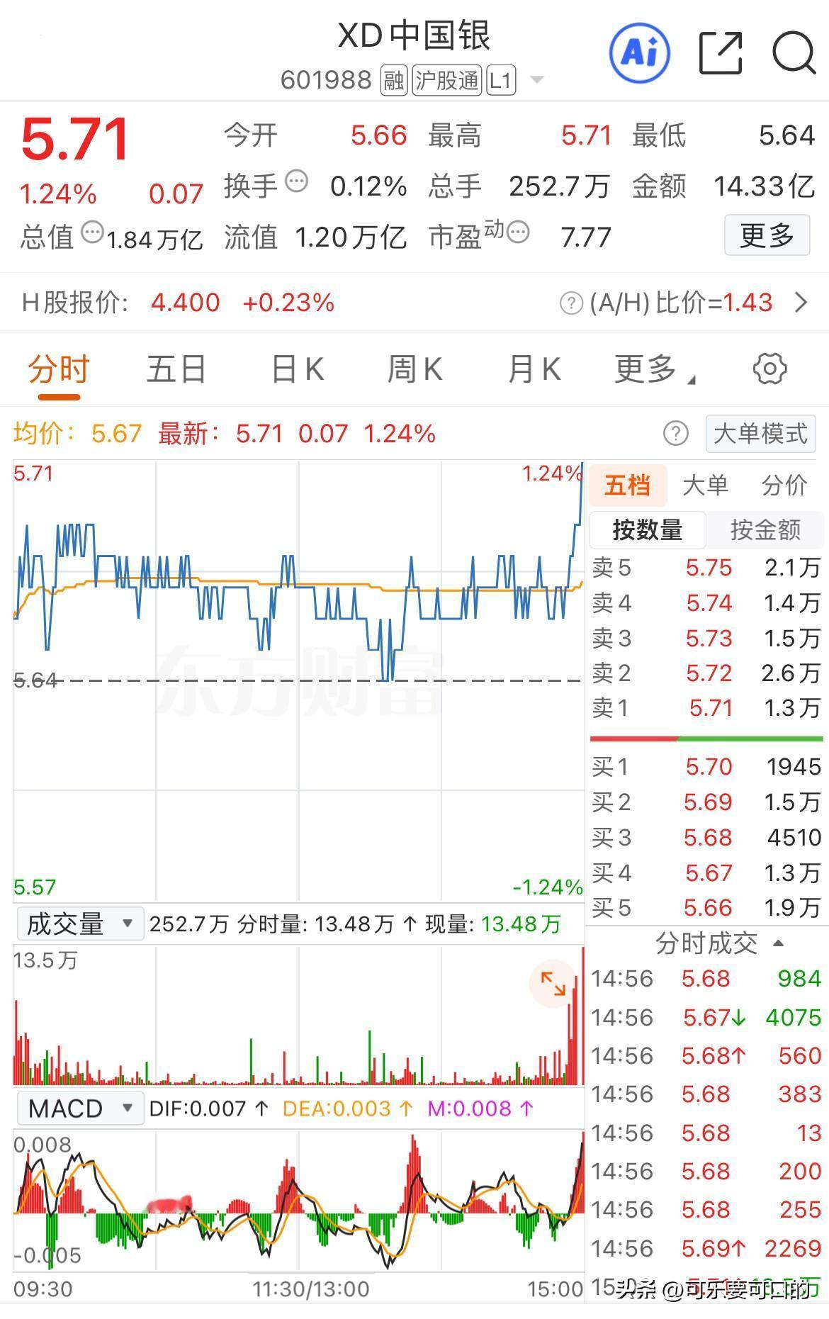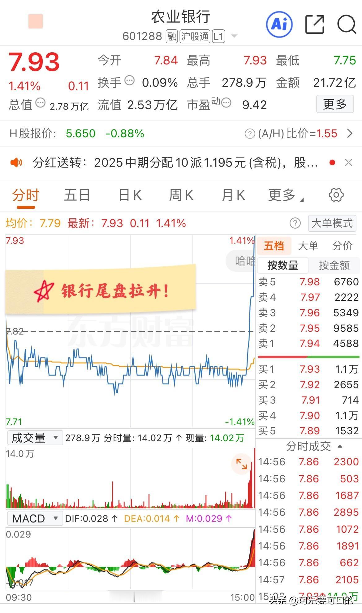 银行尾盘偷袭?硬抬上证指数5个点! 收盘前,沪指还下跌0.81%,但是到集合竞价结束,上证指数却瞬间从跌0.81%(3868)跳到了跌0.7%(3873)! 再一查看四大行的股价,瞬间就明白了! 集合竞价结束后,农行拉了1%、工行拉了0.26%、中国银行拉了0.35%! 此外还有像浦发银行、邮储银行和交通银行等大型银行也均有上翘迹象! 但其实追溯到收盘前10分钟,也就是2点50分的时候农行就已经率先启动了,其直接被从水下拉起翻红! 而之所以这么做的目的很有可能就是控指数,因为当时沪指最低已经跌到了0.96%,再下跌就达到1%了!