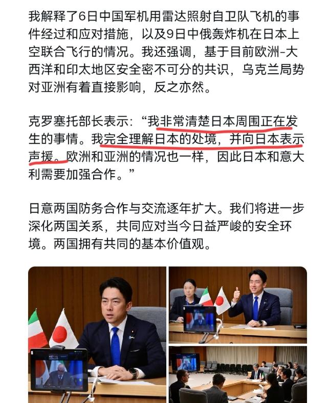 第一个公开支持日本的欧洲国家跳出来了!12月10日,日本防卫大臣小泉进次郎跟意大利国防部长圭多·克罗塞托举行了线上会议。而在线上会议中,小泉进次郎向意大利告状。小泉进次郎表示,我向意大利介绍了6日中国军机对日雷达照射事件以及9日中俄联合轰炸机在日本附近飞行事件的来龙去脉和应对措施。 一件是12月6日的中国军机“雷达照射”事件,另一件是9日中俄联合轰炸机在日本附近飞行的事。可熟悉情况的人都知道,这两件事的真相根本不是日本说的那样。 关于“雷达照射”,中方早就把话说得很明白。当时中国海军在相关海域开展演训,舰载机开启搜索雷达是很常规的操作,目的就是保障飞行安全。反倒是日本战机,擅自闯入中方的演训区域搞抵近侦察,事后还倒打一耙。 说白了,这就是典型的“恶人先告状”,明眼人都能看出日方是在刻意炒作。至于中俄联合轰炸机飞行,更算不上什么“挑衅”。这次联合巡航是两国的例行安排,全程符合国际法和国际惯例,而且编队抵近的区域,恰恰是对日本的一种有效威慑。 毕竟近期日本右翼动作频频,首相高市早苗还屡次炒作“台湾有事”,甚至有右翼人物喊出“核战复仇”这种狂言,完全是在触碰地区安全底线。中俄的联合行动,说白了就是给日本提个醒,让它别太放肆。 可意大利国防部长克罗塞托却直言,自己很了解日本周边情况,完全理解日方处境,还强调欧亚面临的情况一致,呼吁两国加强合作。这番话听着像是共情,实则根本站不住脚。不知道意大利所谓的“了解”,是不是忽略了很多关键信息。 他们知不知道高市早苗在台湾问题上的挑衅言论?知不知道日本这些年一直在偷偷扩军,一心想突破和平宪法? 要知道日本的防卫费已经连续13年增长,在西方国家中都排第二。2024年日本五大军工企业的收入更是猛增40%,所谓的“专守防卫”原则,早就被他们抛到了脑后。 意大利说欧亚面临的情况一致,这更像是虚假的共情。欧洲的安全问题有其历史背景,而亚洲的局势更多是日本主动挑事引发的。意方明明看到了日本的挑衅,却选择视而不见,反而搞阵营对抗。这就是满脑子都是过时的冷战思维,根本没看清当下的局势。 其实意大利这么做,背后的心思并不难猜。它和日本一样,都是二战战败国,近些年在军事领域走得很近。双方不仅在联手研发六代战机,还在搞航母协同训练。这就是想把北约的触手伸到亚太地区,从中分一杯羹。 毕竟有消息显示,北约一直在加速推动“亚太化”,想通过拉拢日本、澳大利亚这些国家,彰显自己的影响力。意大利作为北约成员国,自然想在其中扮演重要角色。 可这种小动作,明眼人都看得一清二楚。在维护区域和平这件事上,意大利的做法显然不光彩。它只想着和日本搞合作,却忽视了日本军国主义复活的风险。 要知道二战的惨痛教训还历历在目,国际社会都该警惕日本的动向。意大利这种不分青红皂白的支持,无疑是在助长日本的嚣张气焰。不过话说回来,意大利就算再怎么为日本站台,也改变不了事实。 日本挑衅的本质摆在那里,不是一句“声援”就能掩盖的。而且现在我们的实力越来越强,应对各种局面都游刃有余。就像这次中俄联合巡航,不仅阵容强大,协同能力也拉满,700公里的距离足以覆盖东京周边的关键设施,日本就算想挑衅,也得掂量掂量自己的实力。 意大利想靠和日本合作来扩大影响力,注定是徒劳无功。毕竟和平发展才是主流,搞阵营对抗、渲染紧张局势,最终只会遭到国际社会的反感和抵制。 其实大家心里都清楚,意大利的声援没什么实际意义。真正能决定地区局势的,还是各国的实际行动和对和平的坚守。日本要是继续执迷不悟,只会遭到更多国家的警惕。