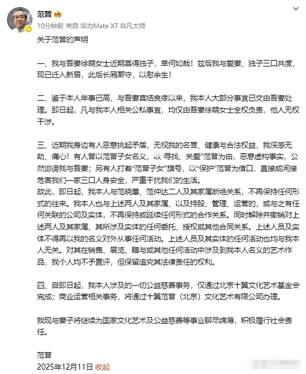 这是宫斗剧还是豪门争产大戏? 看得迷糊了, “独子”是亲的,女儿也是亲的吧?怎么有了独子,“独女”就要断绝关系? 况且独子那么小,啥时候长大能沾光?女儿可是能鞍前马后尽孝道的年纪,正好能用上! 前些日子失联风波刚消停,范增又公开发声,“喜得独子”,又迁入新居,以后和爱妻、独子共度。凡与本人有关的公私事宜均由徐萌全权负责,他人无权干涉。即日起,断绝与范晓惠和范仲达及其家属的关系,不再保持任何形式的往来。 这事范老可得想好了,看着就是这么几句,可能会产生法律效力。 中国讲究一个大团圆,身体健康,家庭和睦才是最好的。