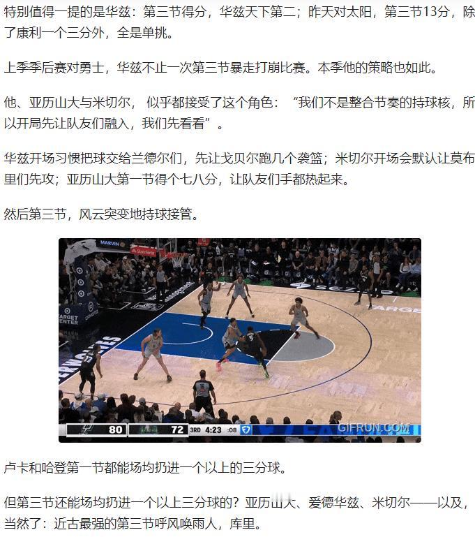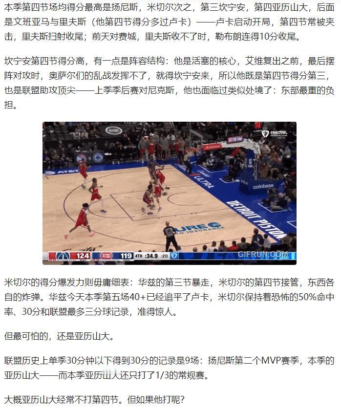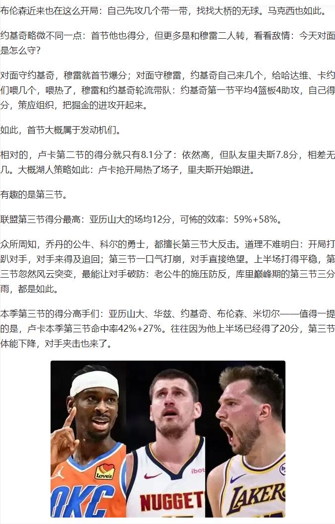 NBA 本赛季的得分版图竟藏着 “时段密码”!卢卡首节场均 13 分 + 51% 命中率领跑,哈登 54%+48% 的真命中率堪称 “开局杀”;亚历山大第三节狂砍 12 分,59%+58% 的效率比巅峰库里还炸裂,第四节 78 分钟轰 100 分零失误更是恐怖。 华兹第三节单挑暴走,米切尔第四节接管比赛,东西部各有 “关键炸弹”。而约基奇堪称例外,无专属时段却场均 30+12+11,喂得队友三人斩 50+,掘金的进攻平衡又极端。 从首节发动机到末节终结者,谁的时段统治力最无解?约基奇这种 “数据溢出” 的 MVP 级表现,难道才是终极答案? 原文来自:张佳玮写字的地方《卢卡哈登的首节,华兹的三节,亚历山大的末节》