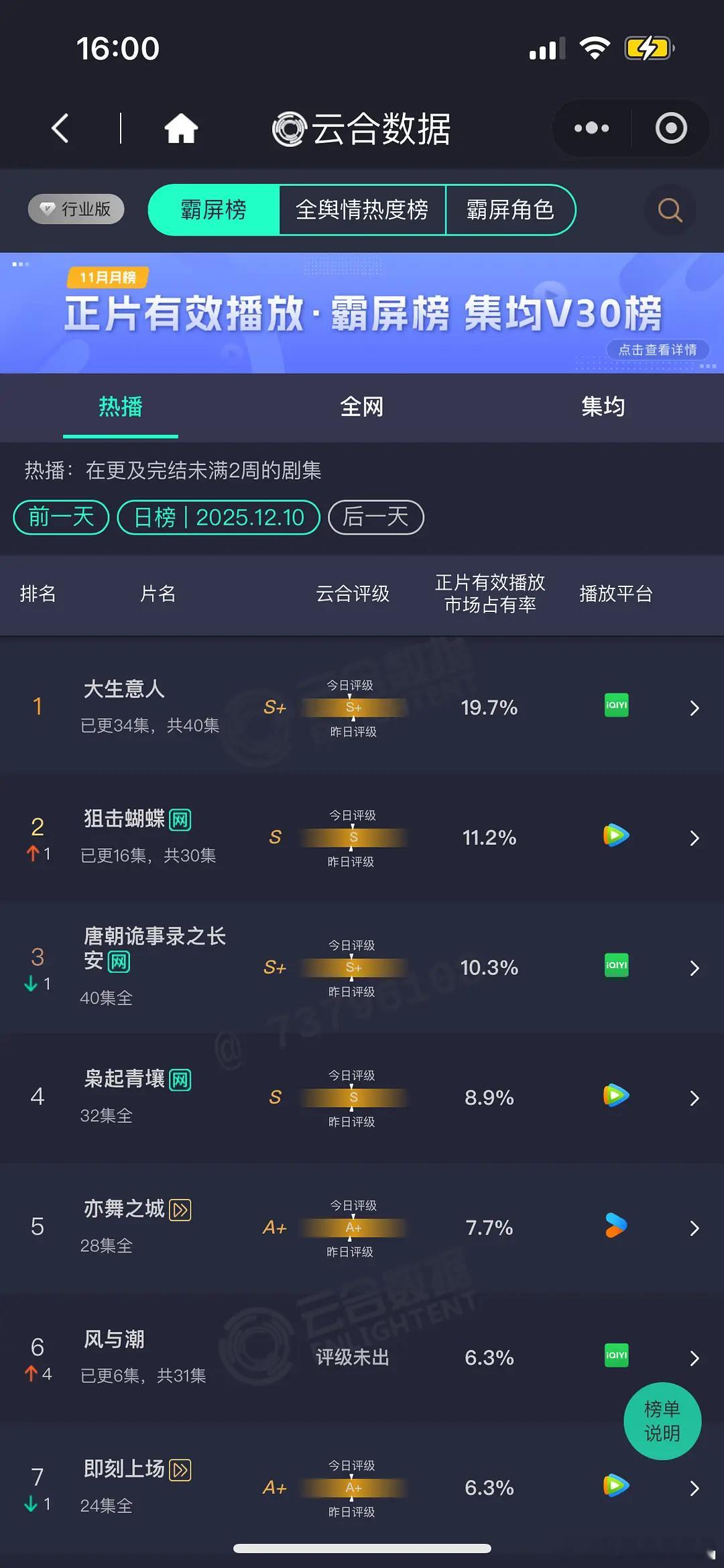 12.10 云合 大生意人19.7% 狙击蝴蝶11.2% 风与潮6.3%