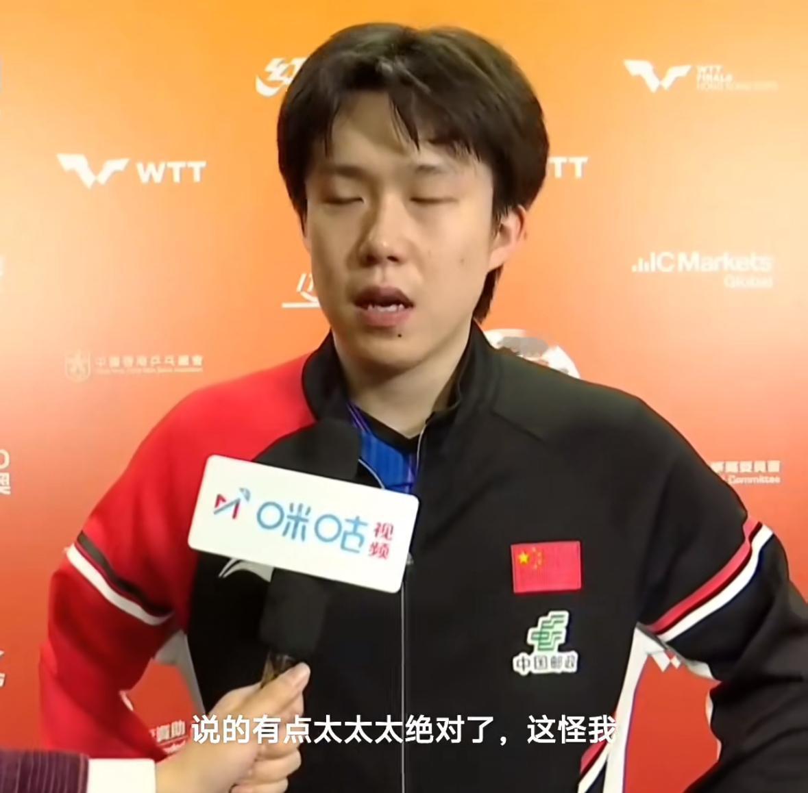 王楚钦说“说错了,纠正一下!” 12月11日,WTT香港总决赛, 混双小组赛第二轮, 孙颖莎/王楚钦3:0林诗栋/蒯曼 王楚钦在赛后采访中表示: “以前说过的谁都赢不了我们, 说错了,纠正一下, 我的意思就是谁和我们都不好打!” 王楚钦说“怪我, 那天太激动啦!” 估计王楚钦好不容易说一次 比较自信的话, 回去被孙颖莎批评了…… 那天突然的自信, 今天又谦虚了! 不过王楚钦始终高调评价莎莎: “莎莎永远保持世界最好水平!” 王楚钦永远是责任自己揽, 对搭档夸夸夸!