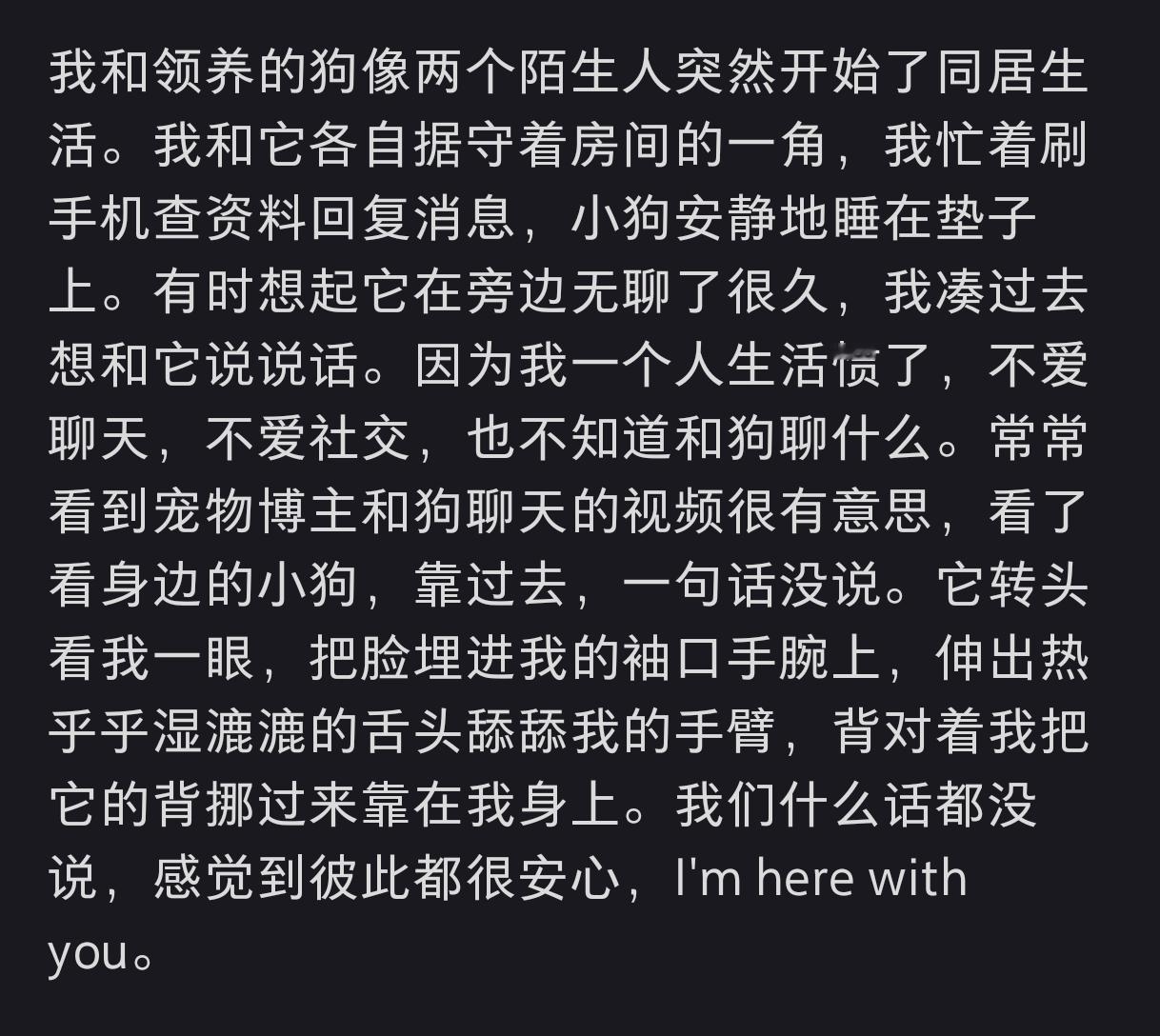 在📕看到两段i人领养流浪狗之后的同居生活,感觉很像某种意义上的『先婚后爱』感觉人虽然不善表达关心,甚至都不是爱宠人士,但尽其所能在努力学习爱它们,对于狗狗而言是心软的神了,好暖哦!我有个闺蜜也是这样的人,很i甚至有点淡漠,但收养了6条狗狗,4只猫猫,都照料得很好,她也是跟以下两人一样,并不擅长照顾人,但看到这些毛孩子时都是如果她不管,就要活不下去的状态,她就走不动放不下了