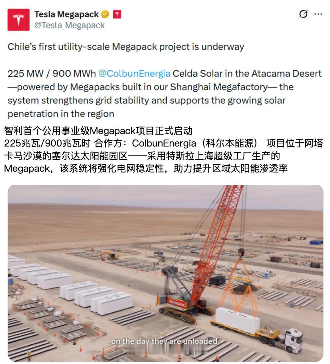 240台Megapack储能系统从上海运往智利沙漠,全球太阳辐射最强区域一整天用电需求都解决了特斯拉海外官方平台表示,近日智利首个公共电网级储能项目正式启动。据了解,该项目坐落于智利北部的阿塔卡马沙漠,装机容量达225兆瓦,储能容量高达900兆瓦时,且全部储能设备均由特斯拉上海储能超级工厂生产提供。项目投运后将大幅提升当地电网的稳定性,应对快速增长的太阳能发电需求。阿塔卡马沙漠有着“世界上最干旱地区”之称,同时也是全球太阳辐射最强的区域,这使其成为智利大规模发展光伏产业的核心区域。昼夜光照差异造成的太阳能供应不均问题,长期阻碍着当地的能源转型进程。智利能源公司Colbún董事长表示:“我们利用特斯拉超大型商用电化学储能系统Megapack,在白天进行储能、夜间释放,这是推动智利能源转型的关键一步。”据悉,此次项目共部署240台Megapack,每日可储存和调配的900兆瓦时电能,足以满足阿里卡市一整天的全部用电需求。为确保建设效率,Megapack从上海储能超级工厂出发,经约45天海运直达阿里卡港,随后迅速运至70公里外的项目现场,几日即可快速完成部署。据悉,Megapack作为特斯拉为公用事业设计的储能系统,能在发电量高时储存能量、在电网需要时释放电量,以此来平衡可再生能源的随机性、间歇性和波动性,为电网提供可靠支撑,是帮人类实现“可持续富足”的关键一环。根据特斯拉第三季度财报显示,特斯拉储能产品装机量达到12.5吉瓦时,上海储能超级工厂产能释放持续助推业务增长。第三代Megapack年产能将达到50吉瓦时(GWh),预计将于2026年下半年开始交付。特斯拉科技改变生活新能源汽车