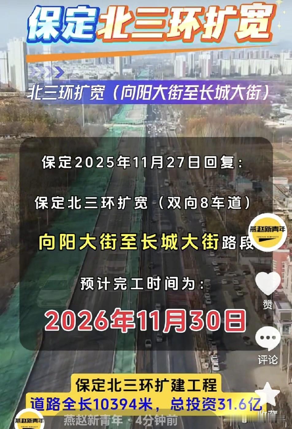 保定北三环扩宽何时完工?扩宽双向8车道,向阳大街至长城大街路段,预计完工时间为2026年11月30日,这次应该不会再推迟了吧?!据了解,保定北三环扩建工程,道路全长10394米,总投资31.6亿!