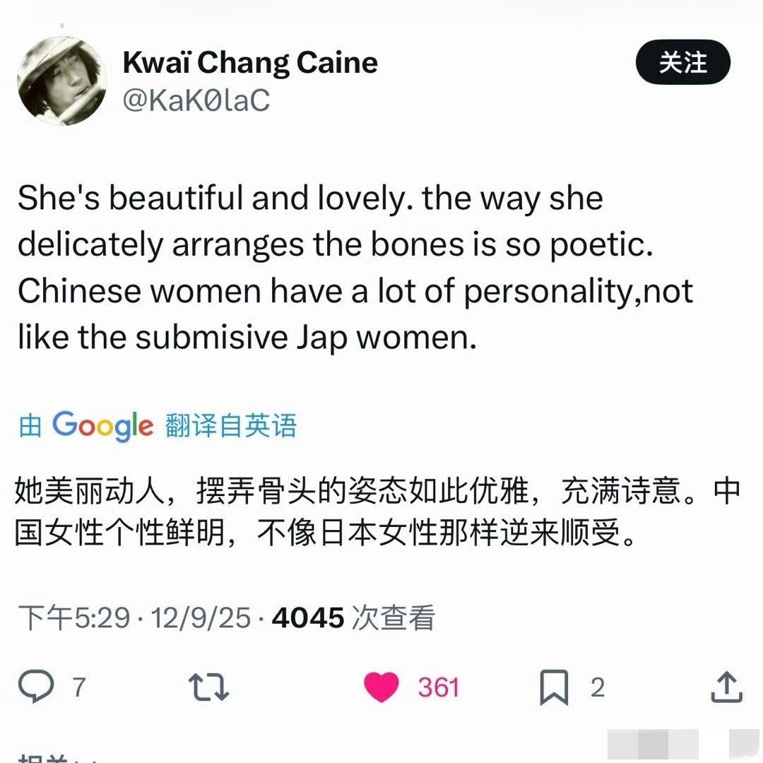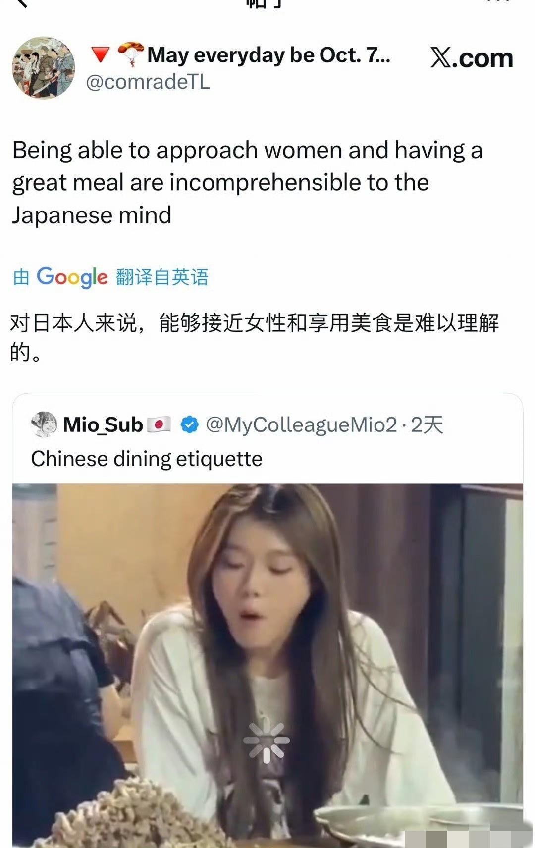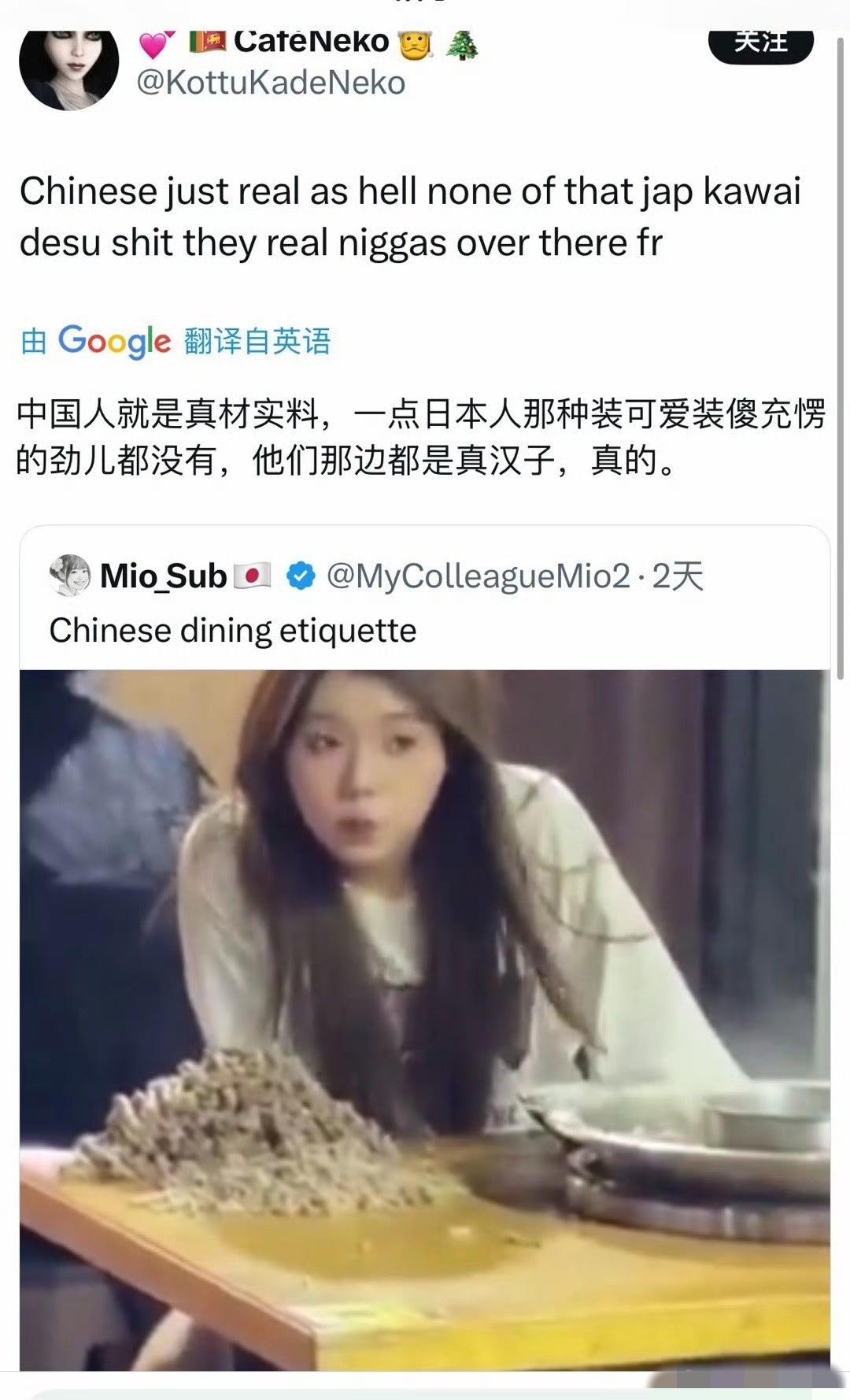 这种日本英文账号就属于不了解英文互联网又想搞外宣,贴这个往桌子上吐骨头的中国女孩想说中国人好脏,但不知道西方男性最喜欢的一个女孩子类型是“长得漂亮但能吃”。那种漂亮姑娘大吃大喝大大咧咧的视频下面经常就有“这是我老婆”的英文评论,结局就是这个帖子的转发区全是英文评论在说日本人吃不起饭/只喜欢40公斤白幼瘦萝莉才挑刺。海外网评 外国友人说中文 老外也懂中文