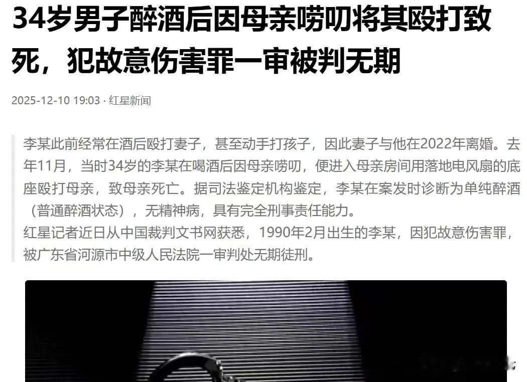 “真是丧尽天良!”广东河源,男子家暴妻子,动手打孩子,和妻子离了婚,他喝酒之后,又因为母亲唠叨他,他竟然冲进母亲房间,拿落地风扇的底座,欧打母亲致死,事后,他向父亲道歉,说自己母亲不行了,父亲害怕自己也被殴打,就赶紧打电话给另外一个儿子。 夜已深,江大娘才听到大门打开的声音,她一听就知道是自己的儿子李某回来了。 说起这个儿子,她真是哀其不幸,怒其不争,好好的一个家,就被这个儿子给打散了。 本来她的这个儿子有一个幸福的家,妻子温柔顾家,孩子可爱懂事,一家三口过着幸福的日子。 偏偏她这个儿子特别暴躁,不但内向,孤僻,遇到事情还会以暴力解决。 他还会酗酒,一喝了酒,净说一些胡话,乱发脾气,动不动就乱摔东西,还把自己的不顺,迁移到妻子身上。一喝了酒,就会打妻子,打完妻子,还会打孩子。 妻子就因为这种事,报警了两次,最后,妻子实在是无法忍受了,这才选择离了婚,好好的一个家,就这样散了。 儿子一身的坏毛病,如今离了婚还不醒悟,还常常去喝酒,江大娘一想到这些,一看到这个儿子,就一肚子的气,她忍不住唠叨起这个儿子。 可她太低估儿子了,她以为自己是亲娘,儿子就不会对她怎么样,但这一次的唠叨,直接让她丢了命。 喝了酒的儿子,一听到江大娘的唠叨声,他就特别的烦躁,脾气一下子爆发了,他甚至将自己的婚姻不幸,归罪于自己的母亲,他早就对母亲的唠叨产生怨恨了。 他控制不了自己,就冲入母亲的房间,一把举起落地扇,拿起风扇的底座,亳不留情地向母亲的头部砸去。 可怜的江大娘,她从来没有对自己的儿子有过任何防备,她从来没想过,自己会被亲生儿子伤害,直到儿子将风扇底座砸过来,她都没有反应过来,直接倒在血泊中。 直到江大娘倒地不起,这个儿子才意识到,他失手伤害母亲了,他跪在母亲的卧室门口,这才忏悔地说道:“对不起,对不起!” 江大娘卧室的动静,惊醒了她的老伴李大爷,李大爷睡眠比较浅,醒来总会去上厕所,他听到老伴卧室的动静,也正想出来看看到底发生了什么。 结果他还没走到老伴的卧室门口,这个儿子就向他忏悔道,我妈快不行了。 李大爷吓得两腿发软,赶紧进入老伴的房间,结果发现老伴躺在床上,头部鲜血直流,他的耳边不断地响起儿子说的话:“对不起,我妈快不行了!” 这一刻,李大爷大气不敢出一声,这时候眼前的儿子,不是他的儿子,这个儿子就如同恶魔般的存在。他害怕自己说错话了,或者做错什么事情了,也同样遭到这个儿子的殴打。 他赶紧走出房间,哆哆嗦嗦地拿出电话,给另外一个儿子打去电话,让他赶紧报警,并且叫救护车。 发生这样的事,李大爷久久不愿意相信,这件事会发生在他们家,他的儿子竟然会如此丧失天良,会将他的母亲殴打致死。 他知道自己的这个儿子比较暴躁,喝多了会胡言乱语,会动手殴打别人,但没想过,儿子竟然会殴打自己的母亲。 这一次儿子殴打的是他的母亲,下一个会是谁,李大爷再清楚不过了。 养育这样的儿子,李大爷非常后悔,如今自己的老伴死在儿子的手下,他难以接受。 事情发生之后,李家人都难以接受,甚至连前妻都惊讶了,想到这样的前夫,如此丧失天良,她在想,如果她晚一点离婚,失去生命的会不会是她呢? 李大爷这个儿子的行为,让人都闻风丧胆,而李家人,事后的举动,却让人感到非常不理解。 事情发生之后,民警把李大爷的儿子带走了,他也认罪认罚,李大爷和家人居然签了谅解书,要求从轻处罚。 这样的结果确实让人感到不可思议,一个儿子亲手结束母亲的生命,居然还能得到家人的谅解,让这样的人能够得到从轻处罚。 如果这样的人继续出现在社会上,大家觉得如此脾气暴躁的人,将会给社会带来一定的危害。 那么,如何认定李大爷儿子的行为呢? 江大娘只是出于一个母亲的本能,唠叨儿子而已,儿子就脾气暴躁,用风扇底座砸她的头,导致她失去生命。 如果当时这个儿子并非有意要剥夺母亲的生命,只是由于脾气暴躁,才做出这样的行为而已,那么他的行为构成的是故意伤害罪。 因为江大娘的儿子脾气暴躁,所以才会在冲动之下做出冲动的行为,他可能并非真的要剥夺母亲的生命,所以他的行为应当认定为故意伤害罪。 《刑法》第234条规定:故意伤害他人身体的,处三年以下有期徒刑、拘役或者管制。 犯前款罪,致人重伤的,处三年以上十年以下有期徒刑;致人死亡或者以特别残忍手段致人重伤造成严重残疾的,处十年以上有期徒刑、无期徒刑或者死刑。 由于他的行为也得到了家人的谅解,所以他只是被判处无期徒刑。 一个儿子剥夺一个母亲的生命,这确实丧尽天良的事情,不应该因为他伤害的是母亲,就对他从轻处罚,应当让他付出应有的代价。 那么你对李某行为有何看法呢?