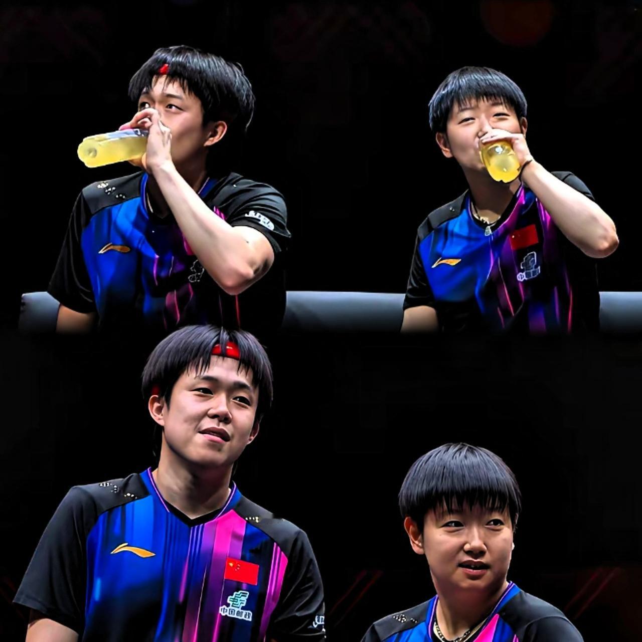 今天这场混双看得真带劲! 莎莎和大头从走T台就开始偷着乐, 中间休息喝水时还抿着嘴笑。 最逗的是最后一个球, 明明擦边了, 俩裁判居然都没看见, 还是大头主动说“擦边了”才改过来。 回头一看裁判台, 好家伙, 计分牌都关上了准备撤, 结果又急急忙忙重新开机…… 最后莎头组合3:0轻松赢了动漫组合, 半小时结束比赛。 弟弟妹妹继续加油呀! 今天现场气氛特好, 连莎莎和大头都被逗得笑出来了~ 就该多笑笑嘛, 笑起来多好看! 真是一场欢乐的比赛!