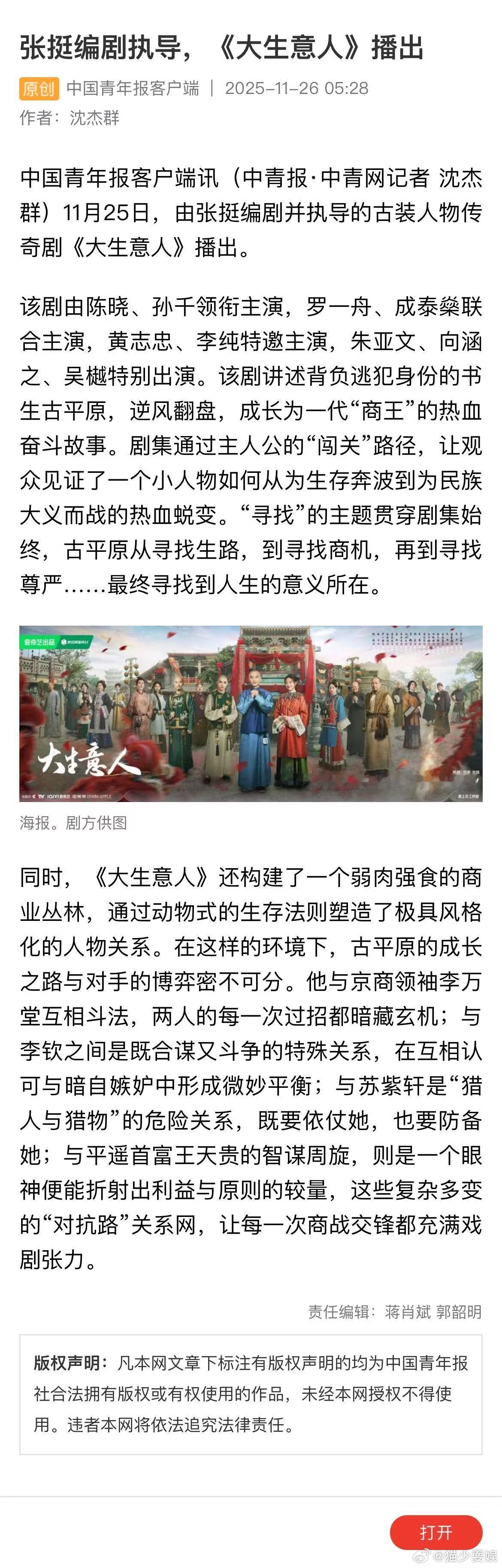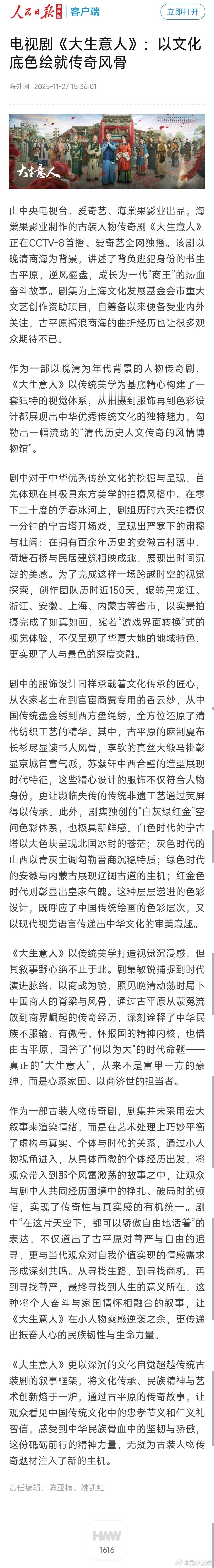 人民日报点赞大生意人大生意人官媒认证的格局!它打破商战剧的常规套路,把晋商信义、徽商智慧与民族商业骨气融入剧情,古平原的创业路满是家国情怀,看一集就多一层感悟!