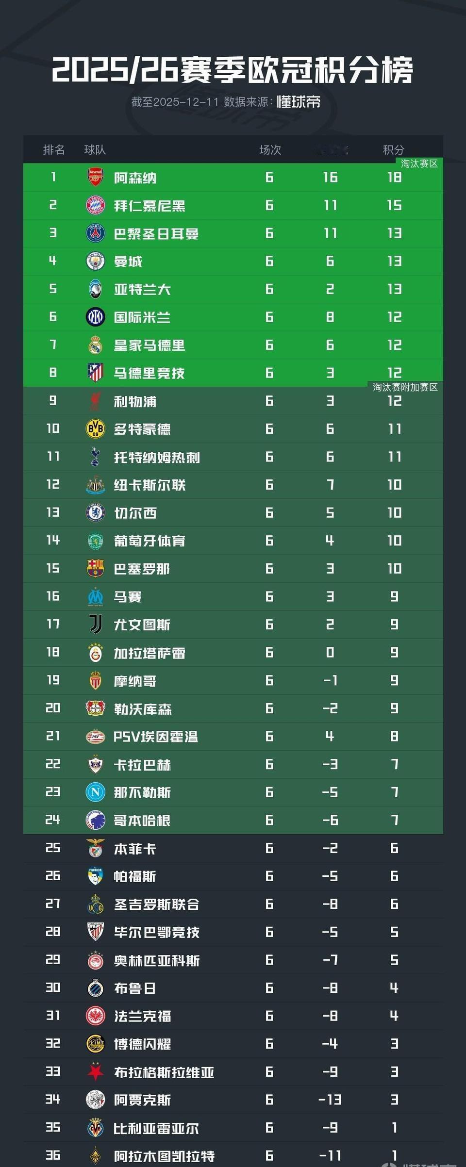 欧冠是真的强弱分明,豪门晋级都没悬念。 目前前十名,只有亚特兰大不是豪门,他们就是外号响亮,真蓝黑..... 切尔西,巴萨,尤文在下半区,淘汰赛附加赛就是多踢一点比赛,晋级16强压力不大。 欧冠前八名会很舒服,基本都是最强球队。[大金牙]