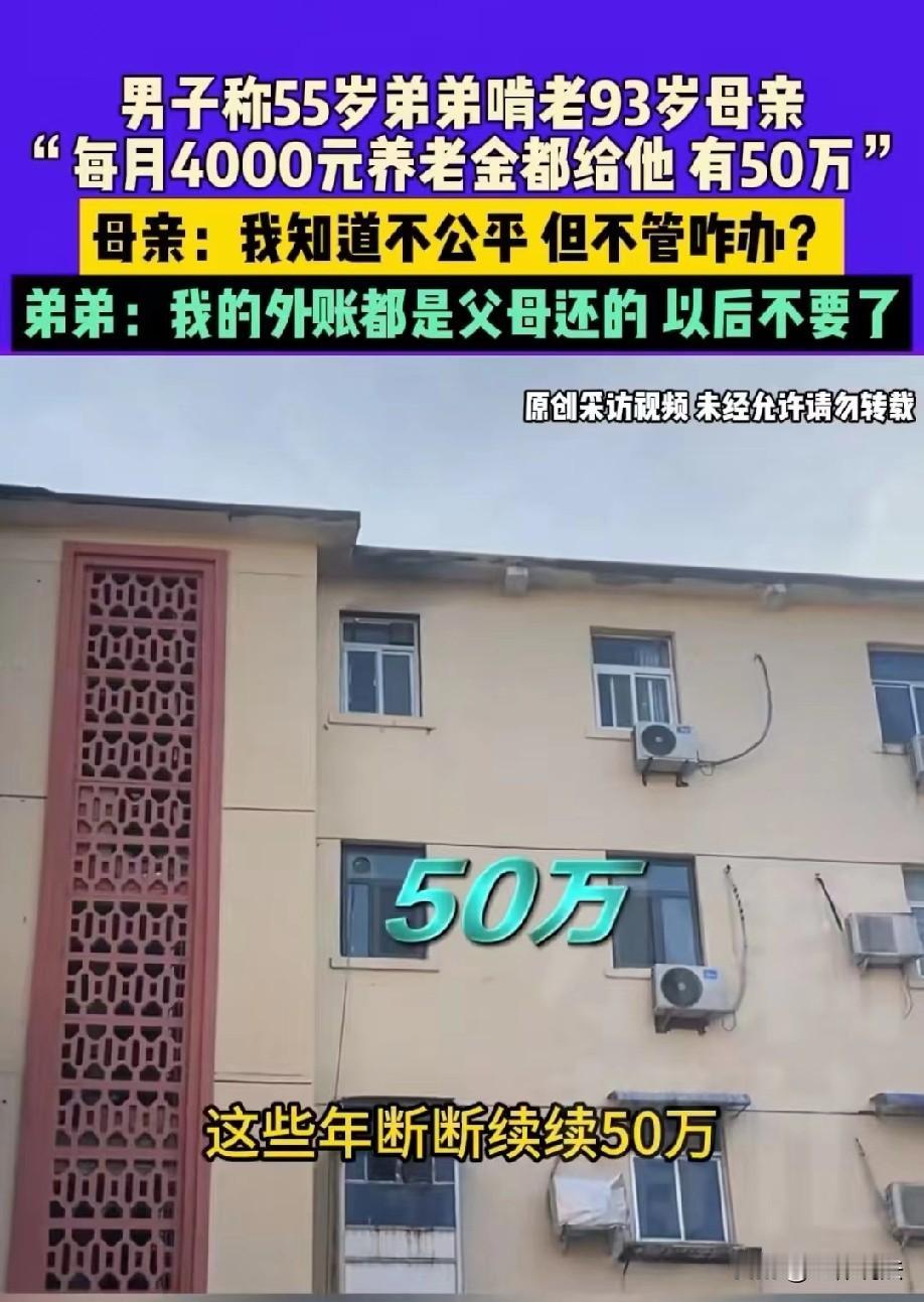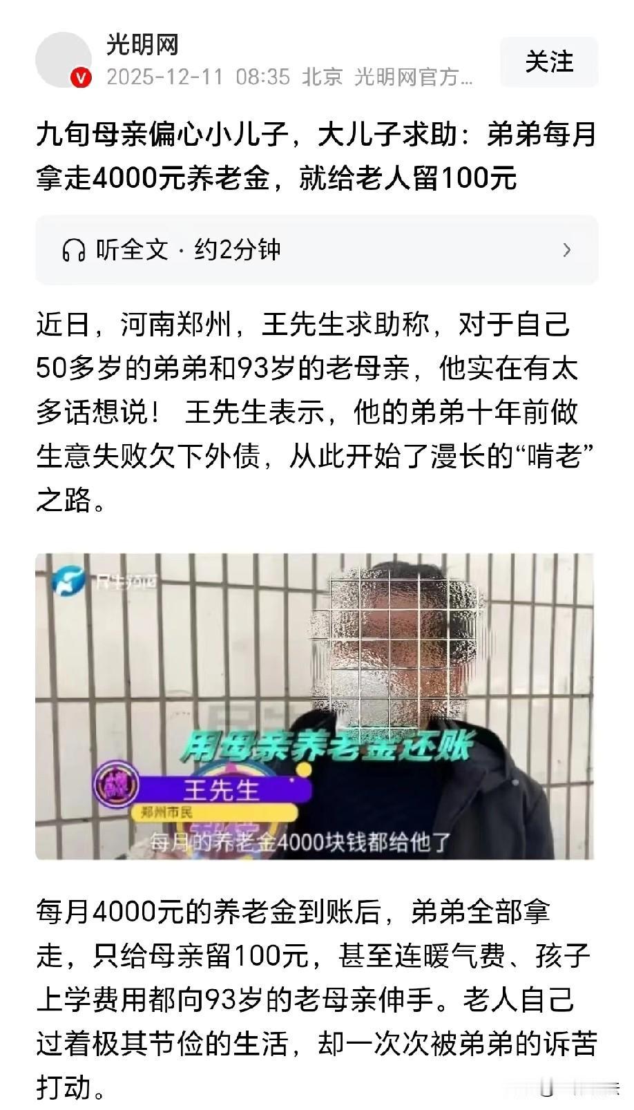 河南郑州,九旬老母亲每个月4000多的养老金一到账,小儿子就全部拿走,只给老母亲留100元的生活费。看着老母亲过的太节俭,大儿子心疼不已,主动承担起老母亲的衣食住行,这一承担就是十年。弟弟从母亲这里陆续拿走约50万还不知足,哥哥也对母亲偏心的做法不满,找到记者求助。老母亲坦言:我也知道自己偏心,但没办法,小儿子曾经给我送过金项链和戒指,看到他过得不好,我就愁的睡不着。 真是家家有本难念的经,93岁的王奶奶,每月揣着4000多块的养老金,本该安安稳稳享清福,可她实际能支配的钱只有100块钱。 这笔养老金一到账,就被50多岁的小儿子全数拿走,每次只给她留100块的生活费。 100块吃饭都不够,这让王奶奶的生活非常艰苦,大儿子王先生看在眼里,痛在心里,只能承担起照顾母亲的重担。 这样的日子,王奶奶一过就是十年,好在有王先生一直照顾,她的衣食住行也能有保障。 眼睁睁看着母亲偏心了十年,王先生也憋了一肚子委屈,提起弟弟就直叹气。 十年前,弟弟做生意栽了跟头,欠了一屁股外债,从那时候起,就盯上了老母亲的养老金,成了彻头彻尾的“啃老族”。 弟弟每次来,不是哭穷就是诉苦,不管是真是假,王奶奶的心一软,就把钱都给了小儿子。 不仅如此,弟弟还连暖气费、孩子的学费,都要伸手向九旬母亲要。 最气人的是,王奶奶自己过得抠抠搜搜,一分钱掰成两半花,可只要小儿子在她面前说说委屈,她就心疼得不行,掏空家底也要帮衬。 这十年里,弟弟陆陆续续从母亲手里拿走了足足50万。 这边王先生任劳任怨,包揽了母亲的衣食住行,想着母亲年纪大了,往后头疼脑热是常事,总得留些钱应急。 那边弟弟拿母亲的钱还房贷、养孩子,把自己的压力全转嫁到年迈的母亲身上,王先生越想越觉得憋屈,实在没办法,只好找来记者求助。 面对记者的询问,王奶奶满脸无奈的表示:我知道这样对老大不公平,可我没办法啊。 她知道自己就是偏心小儿子,但一看到小儿子过得不好,就愁得整夜睡不着觉。 在她心里,藏着一份温暖的念想。那年生日,小儿子送过她金项链和金戒指,就因为这份惦记,她狠不下心拒绝儿子的任何请求。 在王奶奶看来,那点首饰是小儿子的孝心,可在王先生眼里,跟弟弟拿走的几十万比起来,这点东西实在不值一提。 王奶奶心里门儿清,这样下去不是办法,可亲情的枷锁牢牢捆着她,一边是小儿子的苦苦哀求,一边是对自己未来的担忧,这位九旬老人也被折腾得身心俱疲。 记者找到王先生的弟弟,他倒是痛快承认,这些年父母帮他还了不少外债,但他还有二三十万没还清。 说起生活的压力,他把这一切都归咎于需要抚养孩子抚养孩子,他也没办法。 更搞笑的是,小儿子还辩解道:我拿妈的钱还房贷,她那100块花完了,我再给她100块。 这年头100块钱够干什么,小儿子说的这么大言不惭,可知他心里对母亲的孝心有多冷漠。 最终,经过记者一番劝说,弟弟终于当着母亲和哥哥的面承诺:等贷款还完,他就再也不花母亲的钱了。 王奶奶听到这话,也叮嘱小儿子:你也赶紧找个工作吧。 小儿子不找工作,一味的啃老,盯着老母亲的养老金不放过,大儿子却老老实实赡养母亲,这样的对比,高下立判。 从法律角度来说,小儿子侵犯王奶奶财产所有权,需要返还财产。 《老年人权益保障法》第二十二条明确规定,老年人对个人财产享有占有、使用、收益和处分的权利,子女不得以窃取、骗取、强行索取等方式侵犯其财产权益。 小儿子以“诉苦”为由,十年间持续将母亲每月4000余元养老金全额拿走,仅留100元生活费,甚至额外索取暖气费、孩子学费用于偿还自身房贷,该行为已构成对王奶奶财产所有权的侵犯。 即便王奶奶因情感偏袒未明确拒绝,也不能改变小儿子“无权占有”的本质。 小儿子将母亲的养老钱用于个人债务和家庭开支,违背了老年人财产权益不受子女侵犯的规定。 王奶奶作为财产权利人,有权依据上述法条要求小儿子返还十年间侵占的约50万元财产,或停止继续侵占养老金的行为。 而且,小儿子未履行赡养义务,王奶奶还可主张赡养费。 《民法典》第一千零六十七条规定,成年子女不履行赡养义务的,缺乏劳动能力或者生活困难的父母,有要求成年子女给付赡养费的权利。 93岁的王奶奶已缺乏劳动能力,属于法律规定的需赡养对象,小儿子作为成年子女,负有经济供养、生活照料和精神慰藉的法定义务。 但实际情况中,小儿子不仅未承担任何赡养责任,反而长期侵占母亲养老金,导致王奶奶仅靠100元生活费难以维持基本生活,最终需依赖大儿子负担全部衣食住行。 王奶奶有权依要求小儿子支付合理的赡养费,弥补其因养老金被侵占导致的生活保障缺口,且该义务不受小儿子是否偿还完贷款的影响。 但是,以小儿子的行为,到底能不能支付的起赡养费,这还是一个未知数。