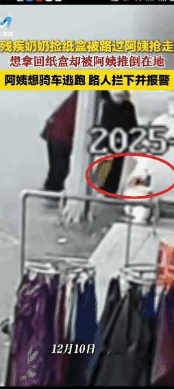 太狠了!浙江温州,一腿脚不便又聋哑的老奶奶靠捡破烂为生,路边的商家都认识她,有了废品就攒着给她! 12月10日,一商家又给了老人一堆的纸箱子,老奶奶一次拿不完,第二次再回来拿的时候,门口的纸箱子却被另一个骑电动车的女子拿走了! 老人喊不出来就哇哇的叫着,追着女人意思让她把纸箱留下来,可女子就当没听见一样,把纸箱放在电动车上骑车就要离开! 正赶上老人追上女子,谁会想到女子一把就将老人推倒在地,老人当时被疼的哇哇大叫!看着好心疼,老人正好磕在马路牙上! 路上的一小姐姐看到后,跑上前去拦住了女子并报了警!这么大岁数的老人摔一下肯定伤得挺重! 真是活不起了,因为几毛钱的纸箱跟一位聋哑残疾的老人抢,你真的缺那几毛钱吗?这下好了,得不尝试了吧!
