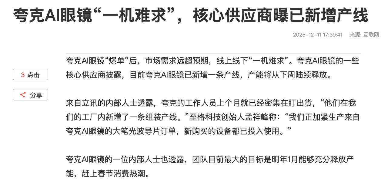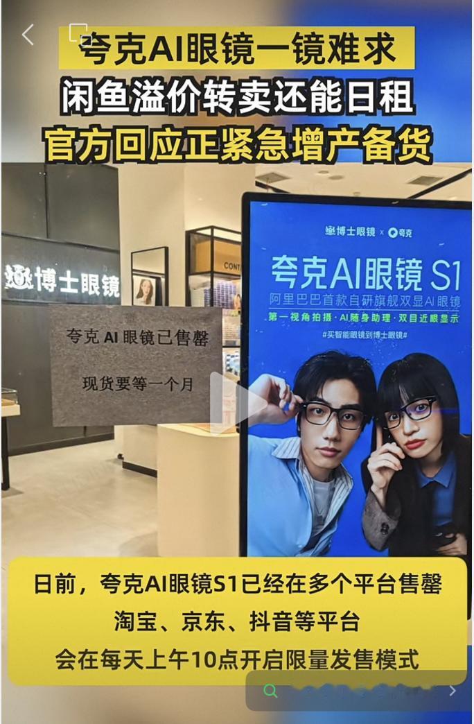 夸克AI眼镜这次的火,是实打实的“国货奇迹”级别。 它不是预热爆、不是营销造,而是靠真实体验穿透市场,把中国科技送上热搜。 短短几天,从天猫到京东,从抖音到线下直营店,夸克AI眼镜在多个渠道全部售罄,出现了久违的凌晨排队抢一副眼镜的场景。二手平台甚至出现溢价一千的现货,仍一镜难求。 但更让人振奋的是,核心供应商直接给出回应,正在加紧生产,还新增了产线,下周起持续释放产能。 这句话背后的含义,让人意识到,有中国供应链撑腰的底气有多足。过去当我们想买一条好耳机、一台高端手机、一副智能设备时,往往要等半年、等一年。而现在因为夸克AI眼镜,因为一个强大的、灵活的中国供应链,这种“等待感”正在消失。 而这次夸克AI眼镜火到断货,并不是偶然,而是中国AI生态从模型、系统到硬件全面成熟的标志。 夸克AI眼镜之所以能迅速引爆市场,是因为它是真正具备“AI时代使用方式”的产品,搭载了千问能力,可以直接在眼镜中完成支付、导航、购物、差旅预订等操作,简直不要太方便。 但最关键的一环,是中国供应链的托举能力,当市场需求暴涨,供应链第一时间扩产;当用户排队买不到,工厂第一时间连夜调线;当出现爆款趋势,产能下一周直接上量。 这种速度,是中国制造的护城河,是全球其他国家望尘莫及的能力,是整个中国供应链为中国产品撑起的底气。 正因为有这样一条链,夸克AI眼镜才能从“小众新品”一天之间变成“全国刚需”;也正因为有这样一条链,中国才能一次次把“爆款”从偶然变成常态。