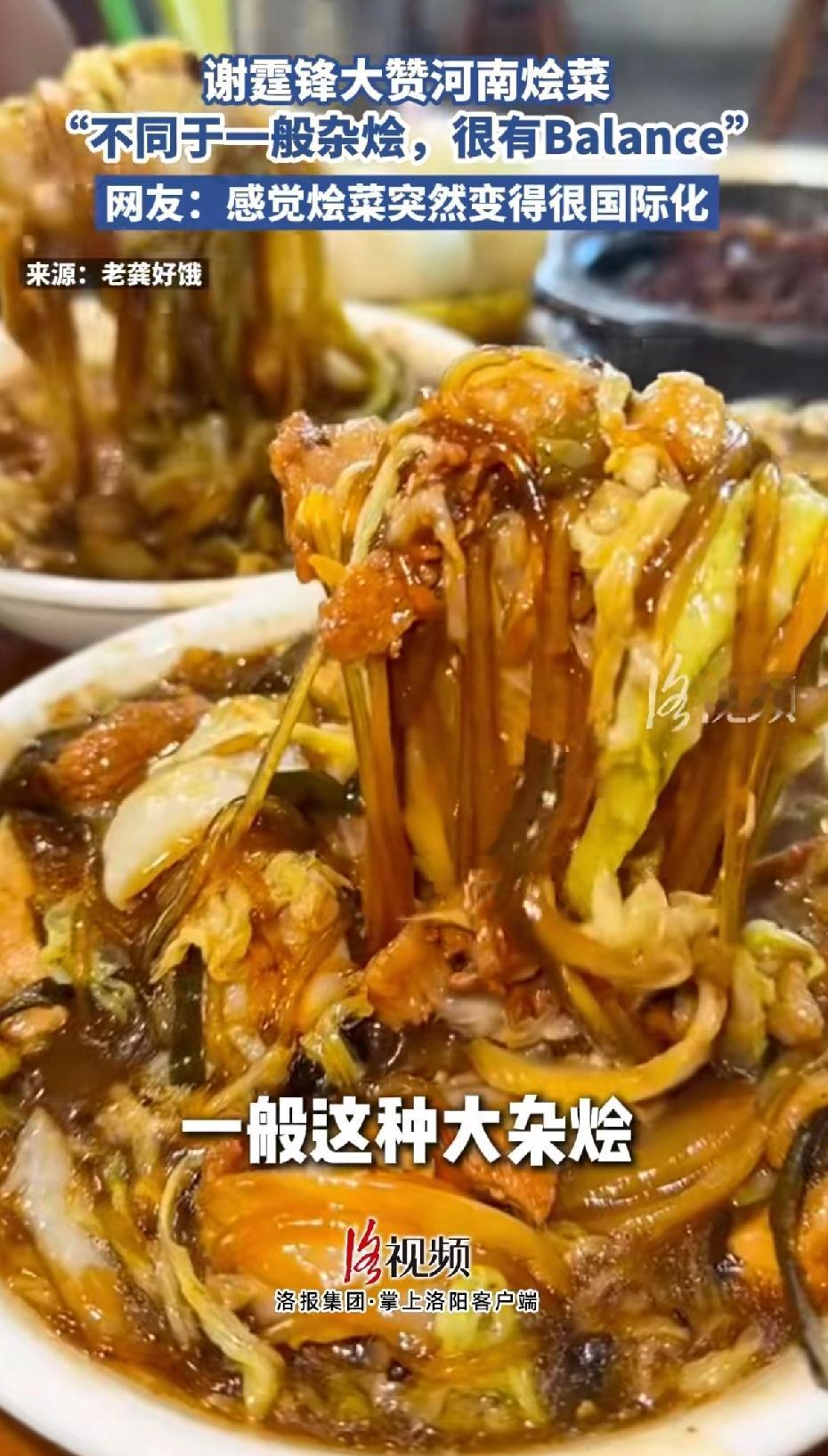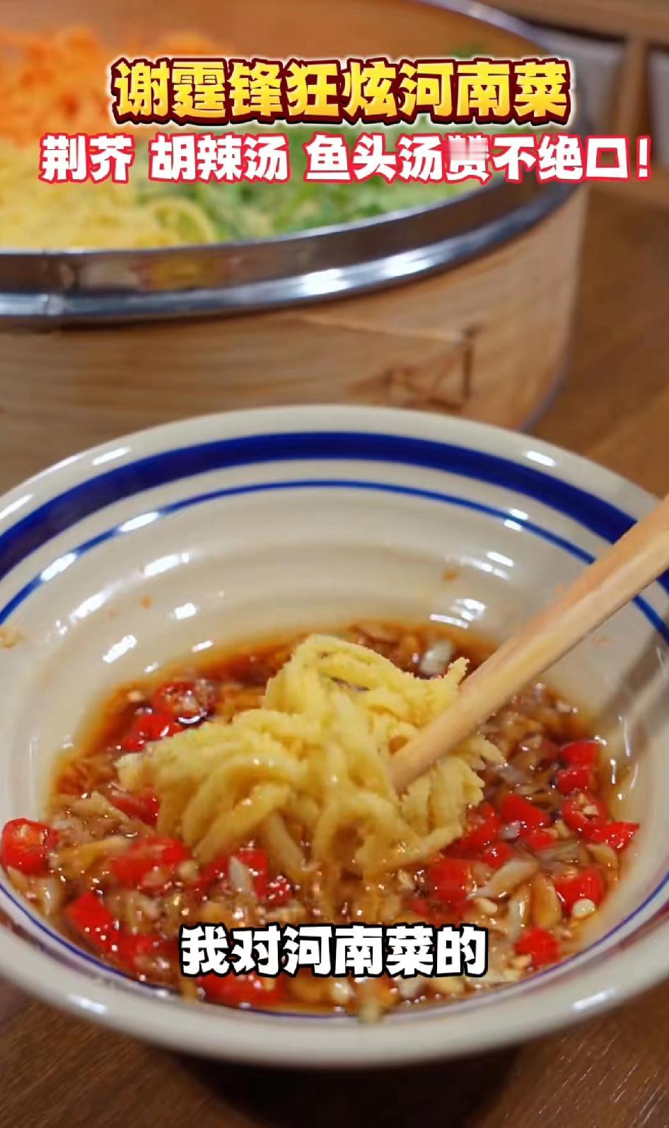 谢霆锋大赞河南烩菜,谢霆锋在北京探店河南菜,直接被狠狠拿捏。 一进店,焦作垆土铁棍山药、洛阳罐罐肉等特色食材就很抓眼球。 他品尝的第一道菜蒸大叶茼蒿,提前用盐拌过,蘸蒜汁吃超棒,他吃得顾不上说话。 拌荆芥让他感慨冬天吃到很新奇。西瓜酱蒸丹江大白鱼,鱼肉鲜嫩,西瓜香与黄豆酱香搭配一绝。 南湾湖荆芥鱼头汤,雪白鲜美。河南大锅菜看似大杂烩,味道却很和谐。 其实应该他应该吃点传统的,“口水菜” 就是办完酒席打包回家,所有荤菜、素菜、凉菜、热菜,一起二次回锅的“杂和菜” 那才是真正的大杂烩。 最后老式鸡蛋汤一喝,浑身暖和。谢霆锋吃完大力推荐多道菜,没吃过的朋友可以尝试一下不同口味的河南菜。