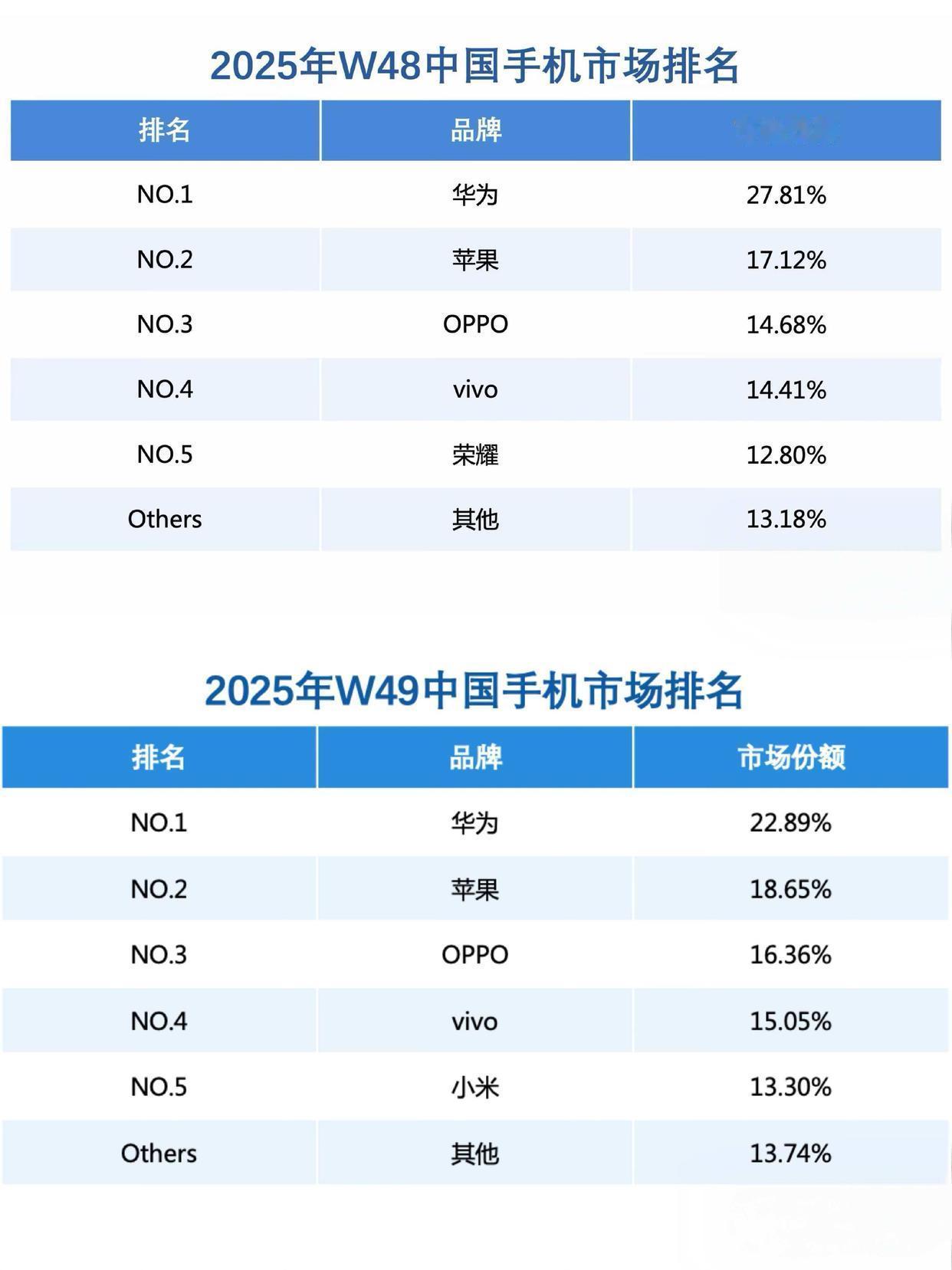 Mate80发布后,华为重夺中国手机市场第一! Mate80用的麒麟9020,约等于高通骁龙8+ Gen1,全新的红米Redmi K50 版 Ultra 高通骁龙8+Gen1,只卖1200!其实也就是这样。 华为和苹果能卖得上高价,就是它们的本事。现在很多光看堆料跑分的。手机商看不清这一点,永远也赶不上它们。 我去查了一下,HUAWEI Mate 80 Pro Max 16GB+512GB才7999元,这可是华为旗舰最好的手机了, 苹果的iPhone 17 Pro Max 512G,要11999。华为最好的旗舰机8000,苹果最好的12000。