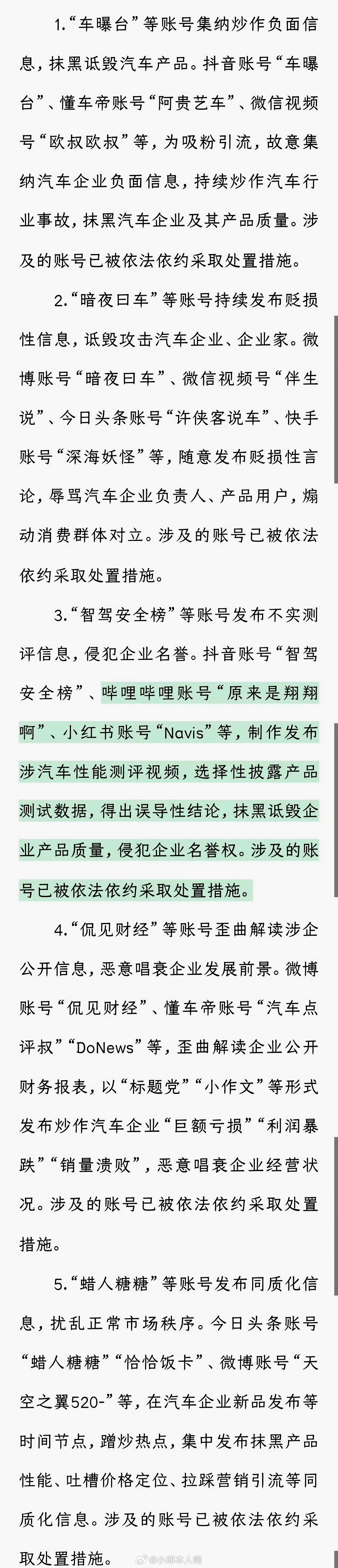 一批专门恶意抹黑汽车企业、散布谣言、制作虚假测评的账号已被依法处理,重拳整治汽车