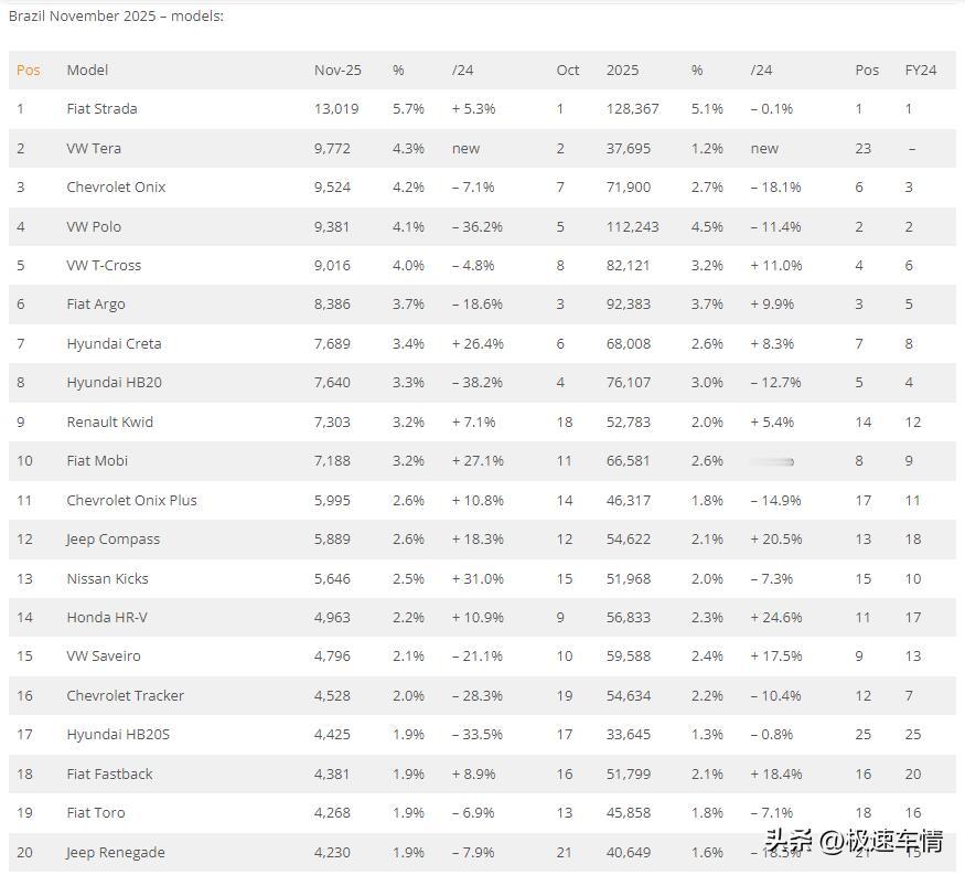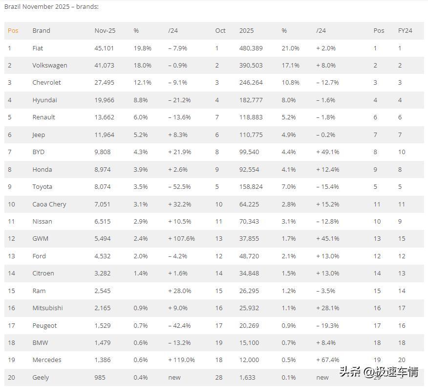 11月,巴西车市,中国品牌销量详情! 前言:大家好,这里是极速车情。今天为大家带来巴西汽车市场11月的销量数据报告。 11月,巴西车市下滑,头部品牌纷纷下滑。比亚迪、奇瑞、长城代表的中国品牌成为增长主力,特别是长城11月表现抢眼,创造多项自身记录。中国品牌在巴西市场加速渗透,几大车企本土化生产功不可没。 2025年11月,巴西新车销量同比下滑5.2%,至228,119辆。 2025年1-11月,巴西累计销量同比增长2.1%,至2,283,818辆。 中国品牌表现: 比亚迪(+21.9%):9808辆,第7名,市占率4.3%。 奇瑞(+32.2%):7051辆,第10名,市占率3.1%。 长城(+107.6%):5494辆,市占率2.4%。 吉利:985辆。 奇瑞Omoda:648辆。 奇瑞Jaecoo:564辆。 广汽:540辆。 福田:129辆。 江淮:96辆。 腾势:23辆。 极氪:21辆。 零跑:16辆。