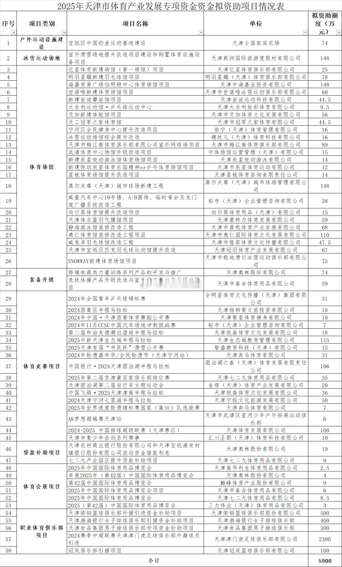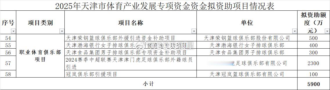关于2025年天津市体育产业发展专项资金。天津市体育局的官网,在这几天公示了2024年的资助项目。一共58个资助项目,其中包括天津津门虎,2024年赛季外籍球员引进项目,金额为2300个W(瞎猜:这钱大概率是外援工资)除此之外,男篮女篮男排女排,也有对应的外援引进资金。天津津门虎 中超联赛天津津门虎