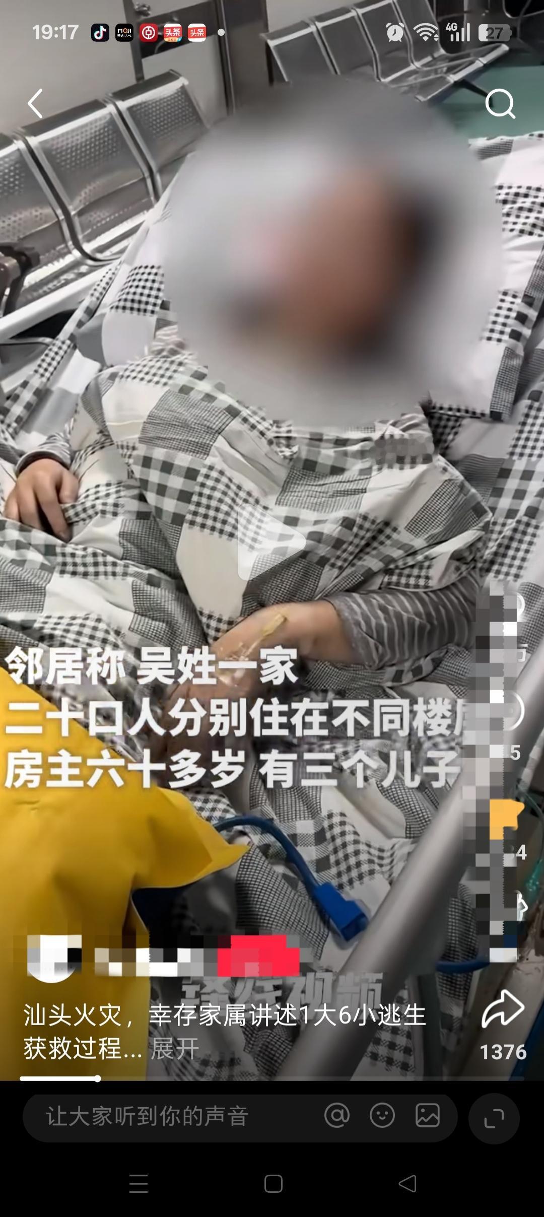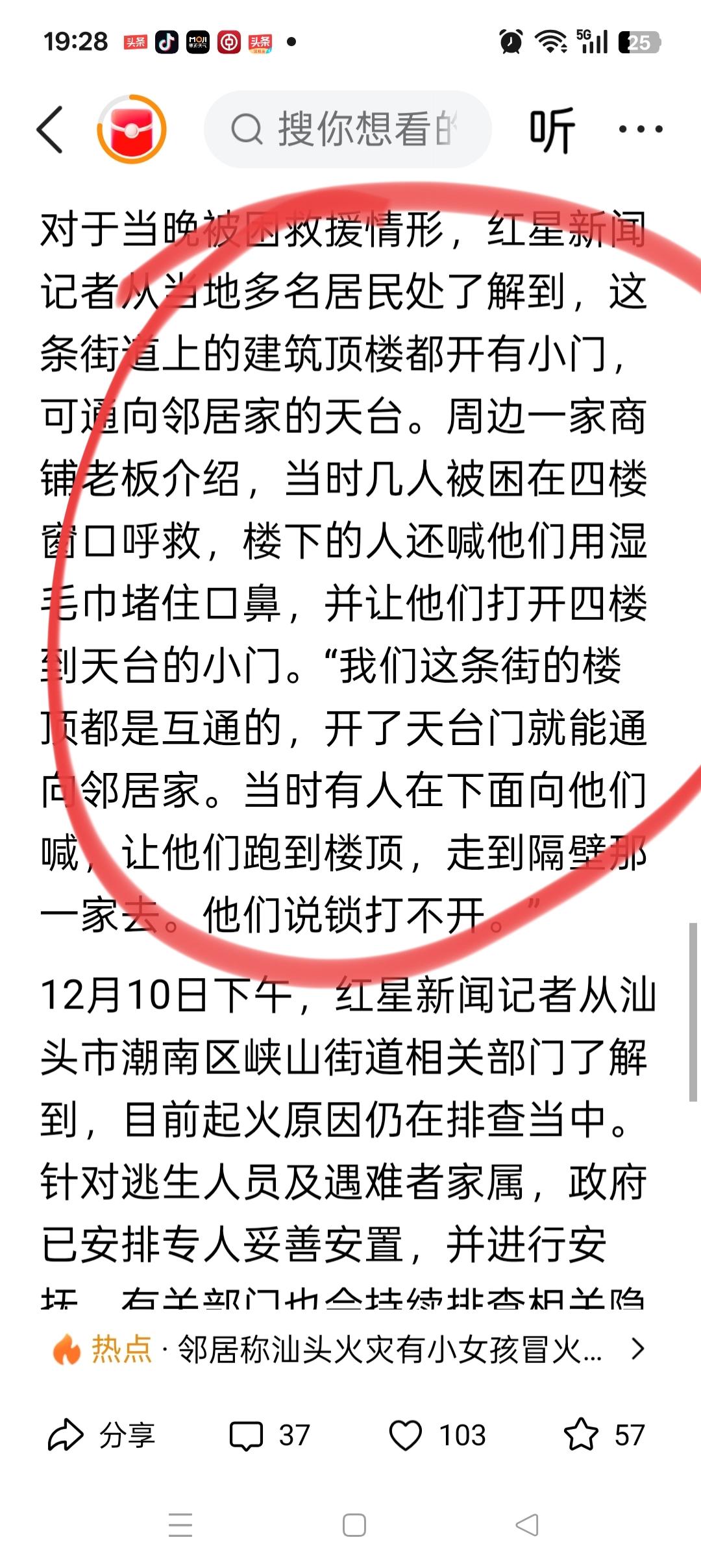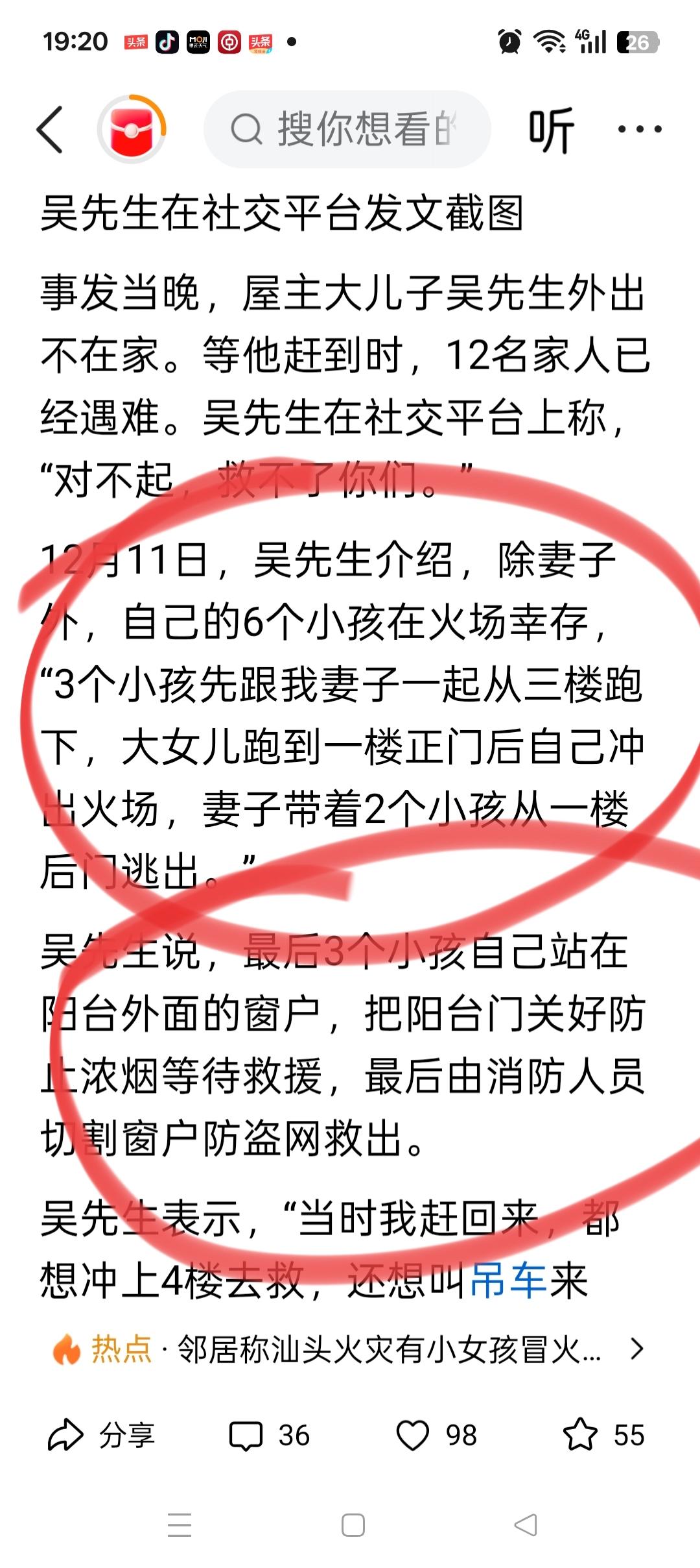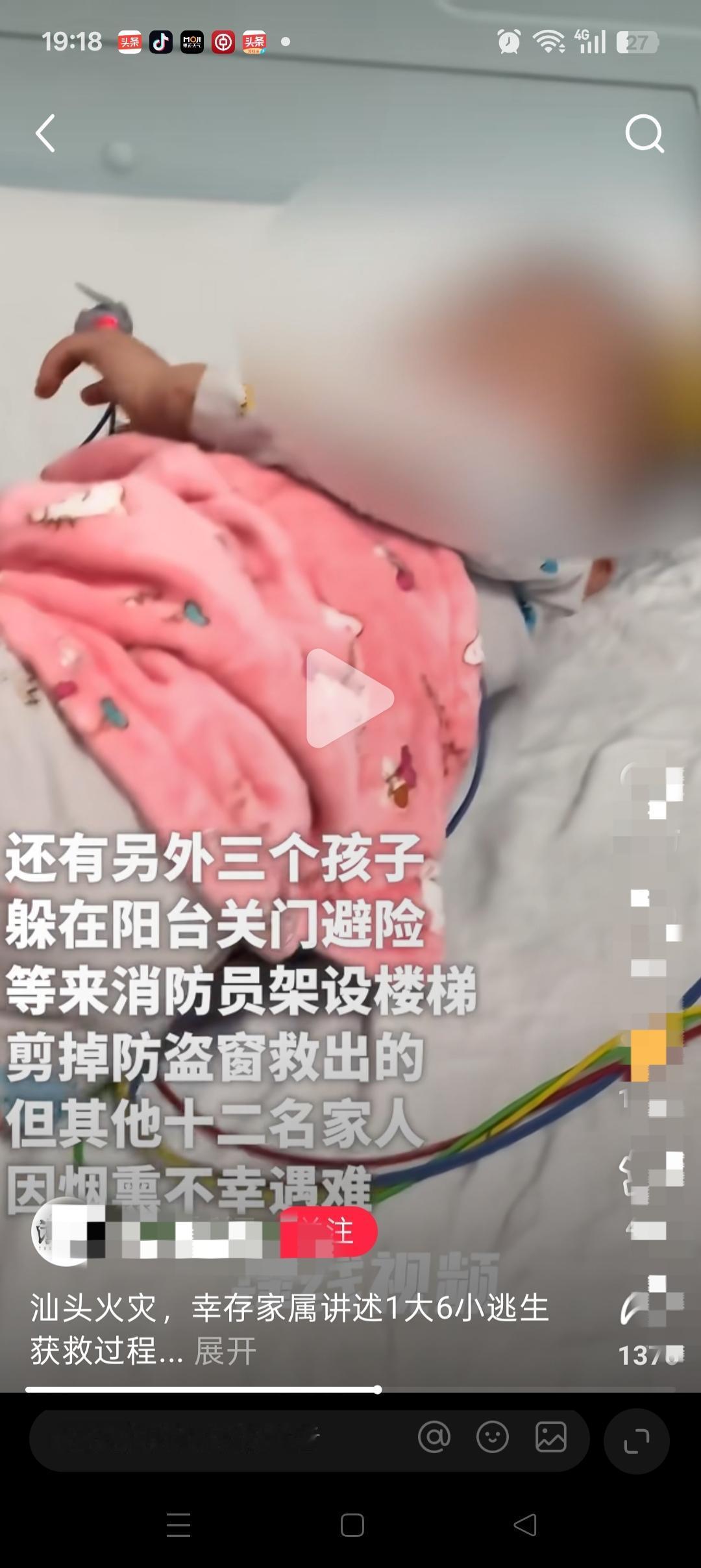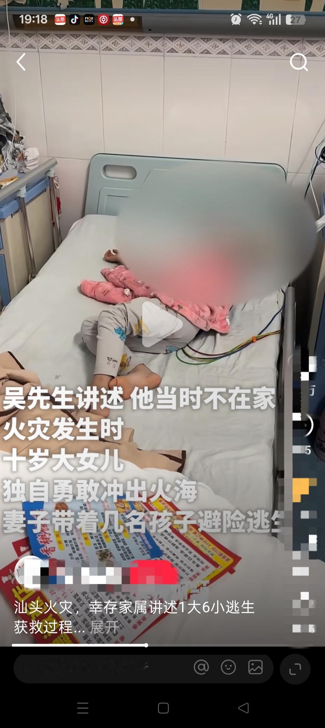 汕头自建房大火, 终于知道这位妈妈为什么能带着6个孩子逃生了[玫瑰]! 原来她们一家住在三楼,3个孩子是跟着这位妈妈一起跑下楼的。大女儿比较快自己从前门冲了出去,她带着2个孩子是从后门跑出来的。 还有3个孩子来不及跑,但是他们躲在了阳台外面的窗户上,并把阳台的门关上了,所以烟雾比较少。 后来救援人员来的也比较快,直接割开了防盗网,救下了他们。 至于其它人为什么没有逃出来,也搞清楚了! 原来他们都住在四楼,通往楼顶阳台的门又锁上了,他们打不开。跑到一楼又来不及了,真的可惜[祈祷][祈祷]