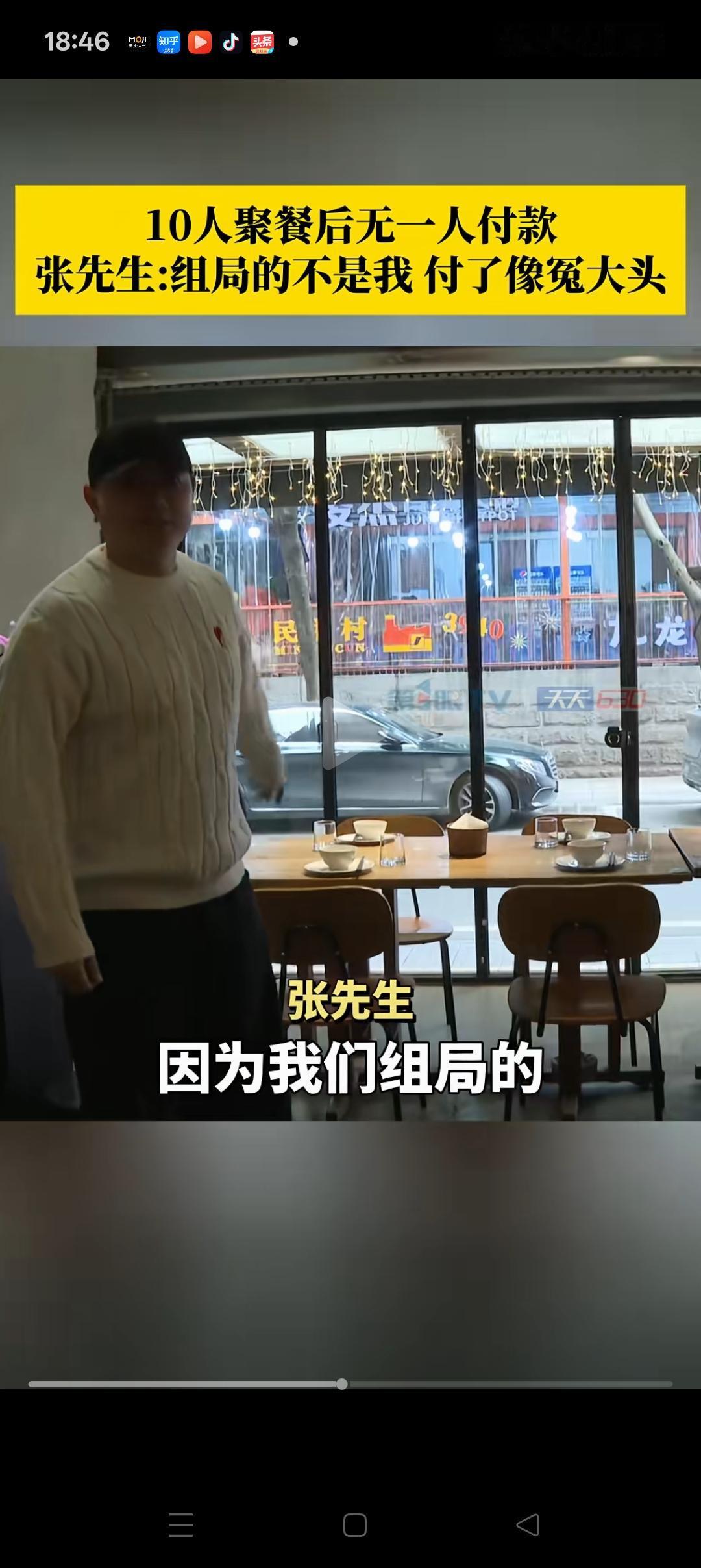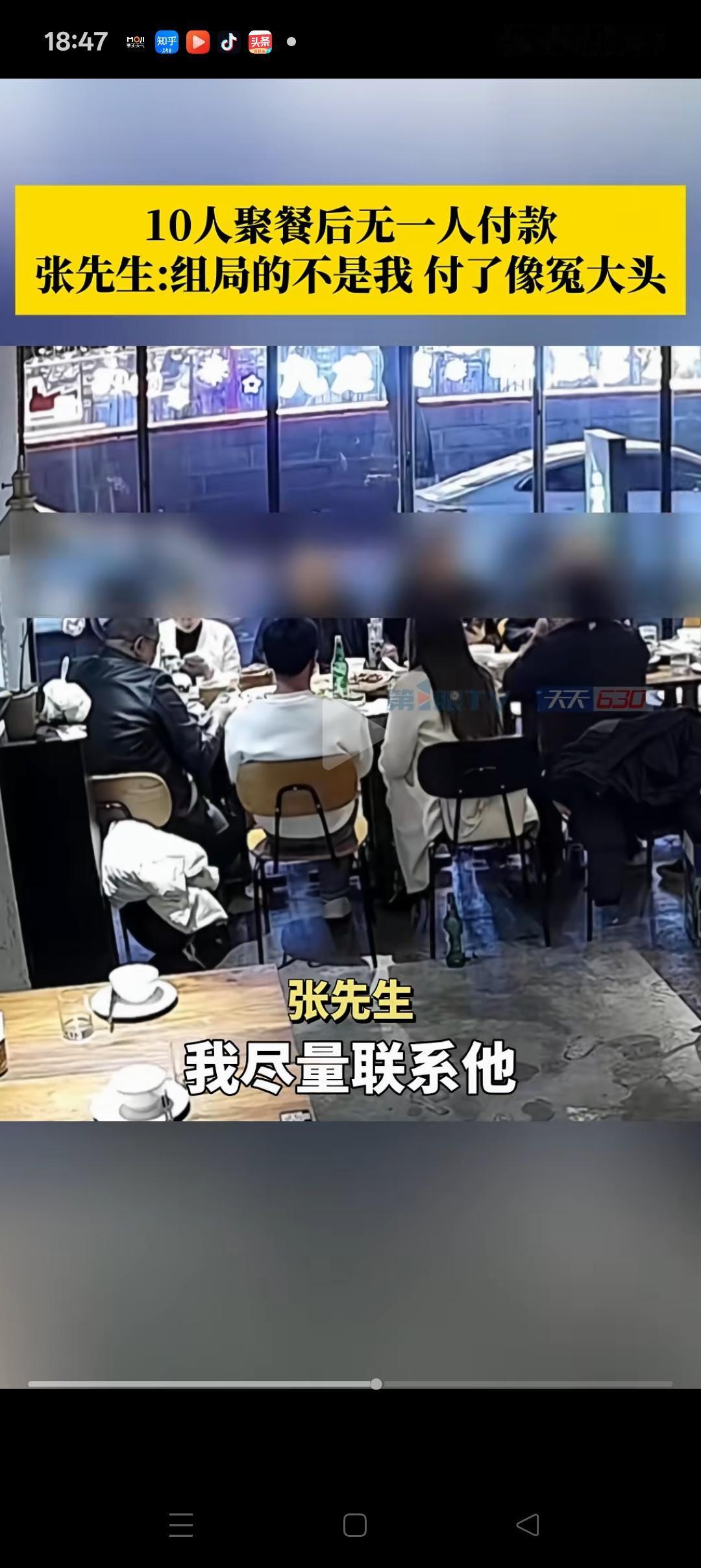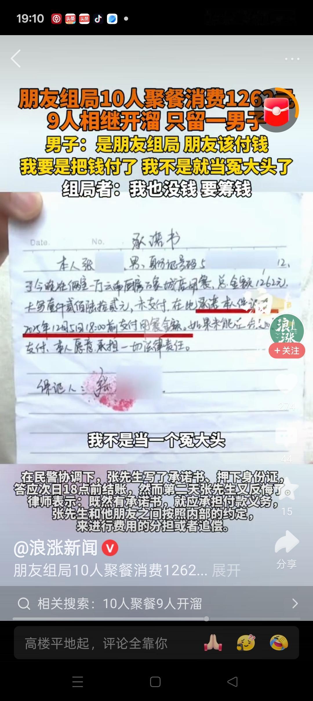 “狐朋狗友就是这样的[捂脸]”,重庆,一朋友组局10人聚餐消费1262元,期间9人全部开溜。剩下的张先生一句话更是绝了:谁组的局就该谁给钱,我要是给钱,不就是冤大头了吗? 这个张先生也是离谱,当着帽子叔叔的面写下保证书,还押了身份证。回去后就反悔了,说组局的人不给钱,他也没办法,后面干脆电话也不接了。 虽然按道理确实是组局的人出钱,或者是AA制。但事情已经发生,也不至于1200块钱拿不出来吧,还说话不算数。 看他写的字还挺工整的,估计读的书也不少,居然会这样做。[笑哭] 凑出这么一桌人也不容易,店老板下次一定要先收钱,保证书根本没用的。。