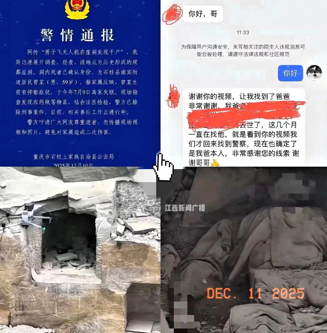 重庆崖洞干尸终于找到主了, 59岁父亲的选择戳痛了无数人! 曾大叔带瓶农药、裹床毛毯躲进葬崖洞,四个月后才被无人机发现,这份“沉默的父爱”太沉重了。 “不想拖累子女”从来不是深情,而是被忽视的绝望与无助。59岁的曾大叔带着工地留下的旧伤,被“干不动重活”的自卑困住,抑郁症缠身却没得到真正关注,最终用极端方式告别,戳破了“养老只靠物质”的谎言。 子女不是不孝顺,只是房贷车贷的压力让人步履匆匆,却忘了父母最怕的不是穷,是“没用了”的孤独感。 社会喊着关注老龄化,可老年人的心理关怀不该只停留在政策口号里,一句耐心的倾听、一次主动的陪伴,远比金钱更能填补他们的空虚。 真正的孝顺,是让父母觉得自己依然被需要。你愿意今晚就给家里老人打个电话,好好聊聊心里话吗?