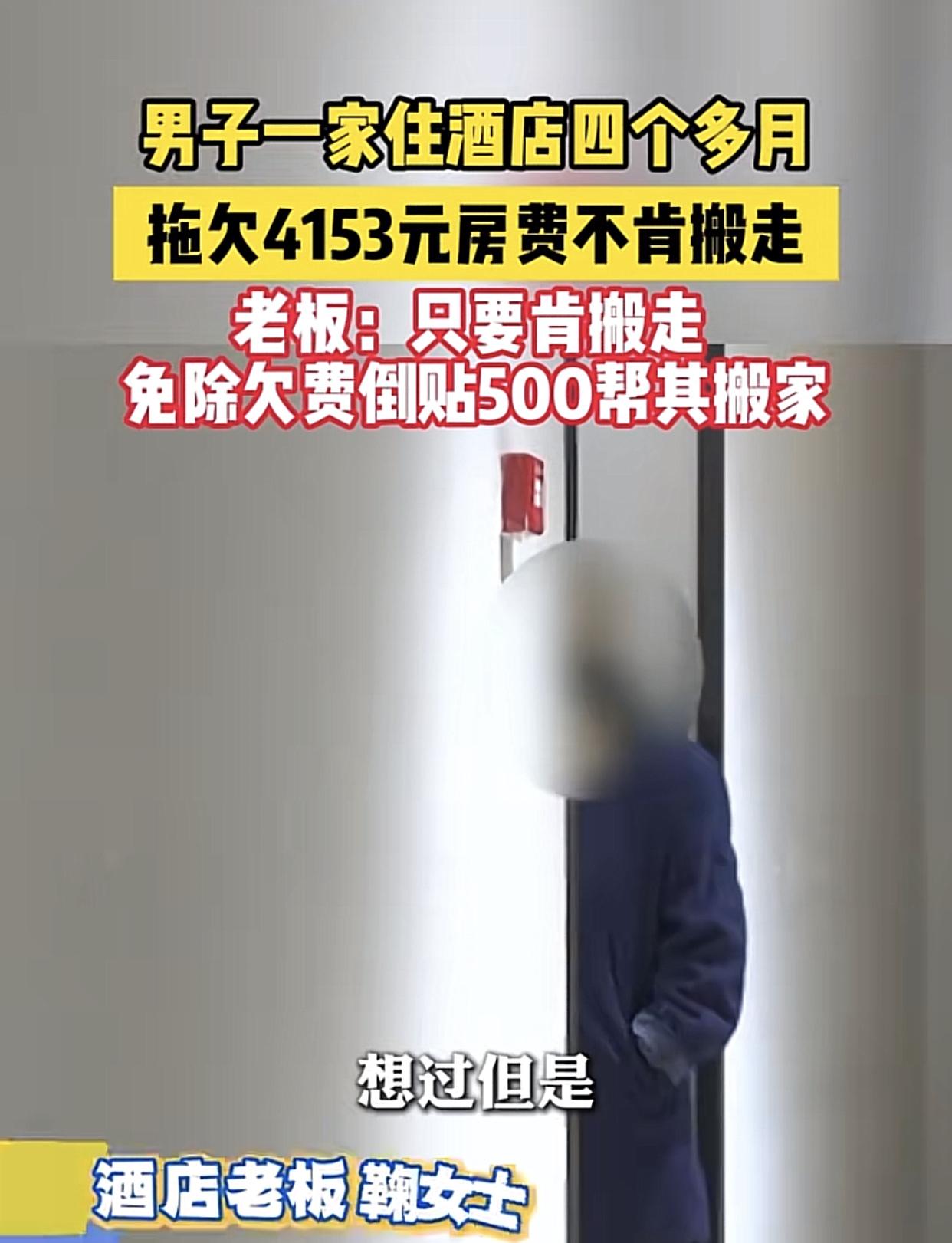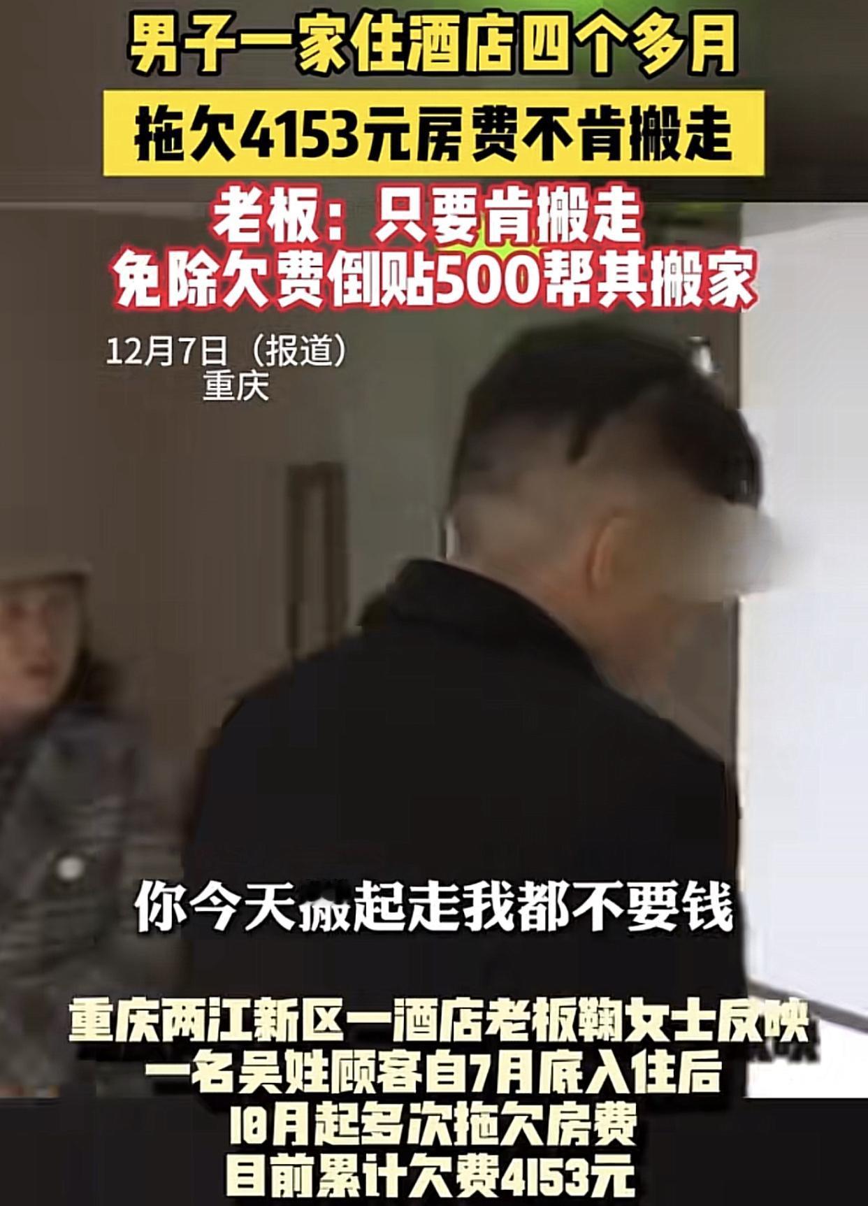 老赖见得多,住酒店釆取“人不离房”的老赖,这招是真高! 重庆一家酒店女老板在今年7月接了一单大生意!一名外地男子带着80岁的老母亲和10岁儿子住进她酒店,讲好房费140元/天,男子说估计住上几个月。 头一个月,男子还按时缴费,到了10月起他突然停止支付房费,直到12月份共拖欠两个多月累计4153元。酒店女老师一次次上门沟通,得到的始终是“再等等”“没钱”“通融通融”的敷衍。后来无计可施酒店采取断电断水,可男子一家如磐石般一样扎根酒店,就是不走。 迫于无奈,酒店女老板决定房钱不要,再倒贴500出车费,恳请男子一家搬出,可男子就是不搬。 住了4个月,也就是欠费开始大概只付了小半,请他们走过,未果,报警,属经济纠纷,没权干涉。老板在无奈的情况下,倒出搬家费500让其搬去了,是个明智之举。否则,时间越长,越难办。 这家人不是聪明,而是老赖脸皮厚,酒店老板只要有心就可以起诉他们,胜数几率也大,只是就算判赢了,这家人也不可能赔偿,而且还倒贴打官司的钱。看来,酒店这单生意是赔定了。