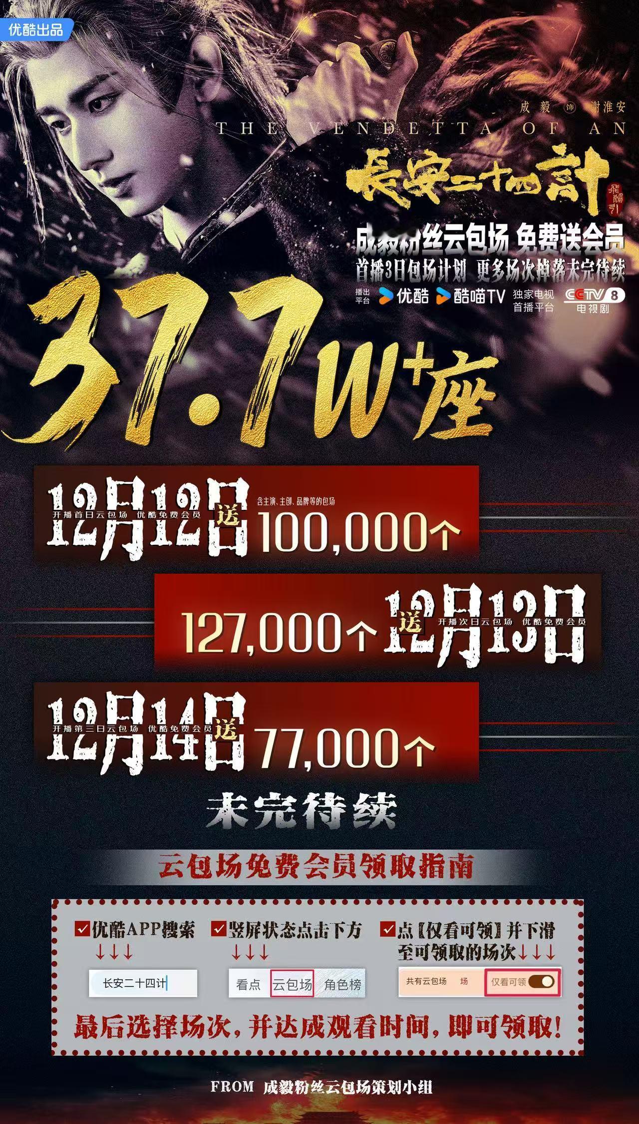 成毅粉丝《长安二十四计》千万级云包场,期待大家明天晚上18:00来抢。(黑粉也可以来,反正也拦不住!)