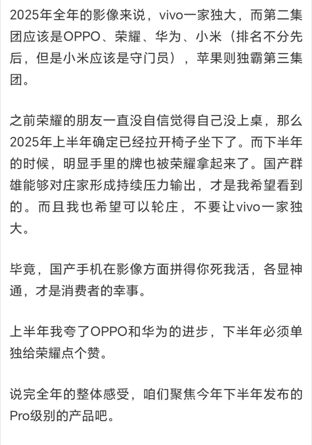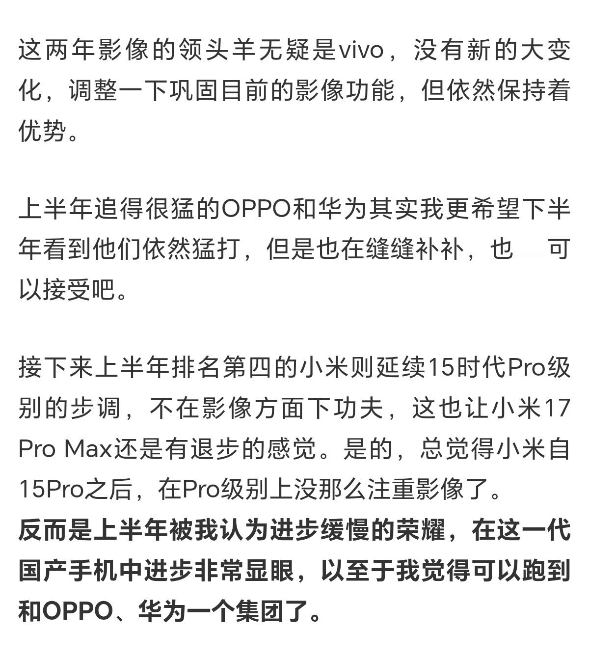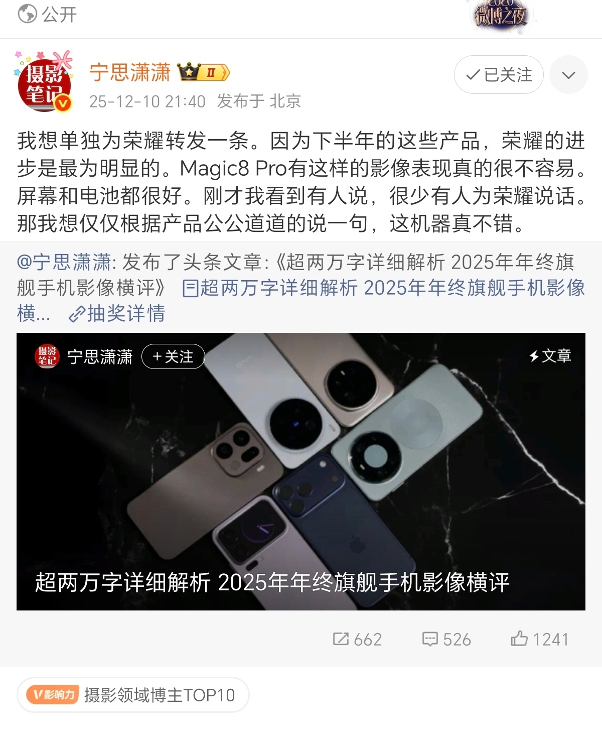 耀子影像这波进步连专业人士宁思潇潇都给出了肯定,这含金量不言而喻。自Magic8登场,影像实力就实现了质的飞跃,曾经的短板如今已不复存在。和一众友商较量时,也丝毫不落下风,打得有来有回。真心期待耀家的影像能持续发力,一路披荆斩棘,早日登顶影像之巅!