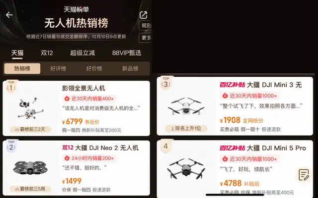 影翎占据着天猫无人机热销榜头把交椅,可紧随其后的友商大疆,便宜的款卖一两千,贵的也不过四五千元。