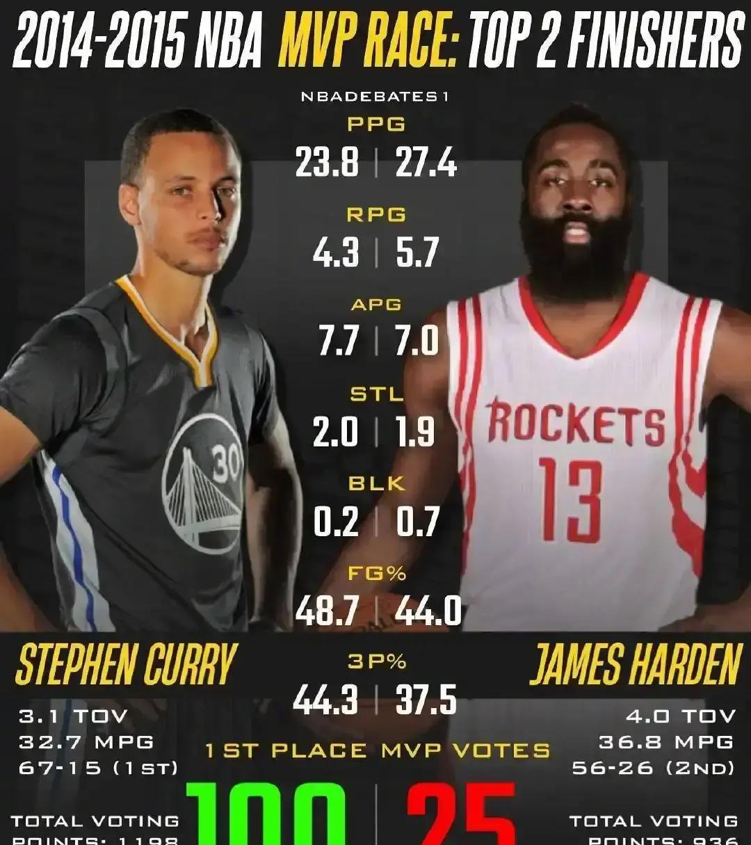 看到有人还在为14-15赛季的哈登喊冤,我是真没绷住。 这都多少年了,还在拿那3.6分的场均分差说事儿? 承认别人优秀很难吗? 当年勇士67胜,把火箭甩开了足足11个胜场。这是什么概念?放在现在的西部,这就是断档式的差距。 哈登确实能抡,场均10.2个罚球看着是热闹,但效率呢?整体命中率44%,甚至还不如库里的三分命中率高。 这就好比你吭哧吭哧搬了一天砖,人家用全自动机械臂两小时干完了,你非说你流汗更多所以你更有价值。 当年100张第一选票投给库里,那不是偶然,是碾压。 有些人总是试图用“苦劳”去挑战“功劳”,却忘了MVP评选从来不是比谁更惨、谁更累。 赢家通吃,这才是竞技体育最残酷也最迷人的地方。