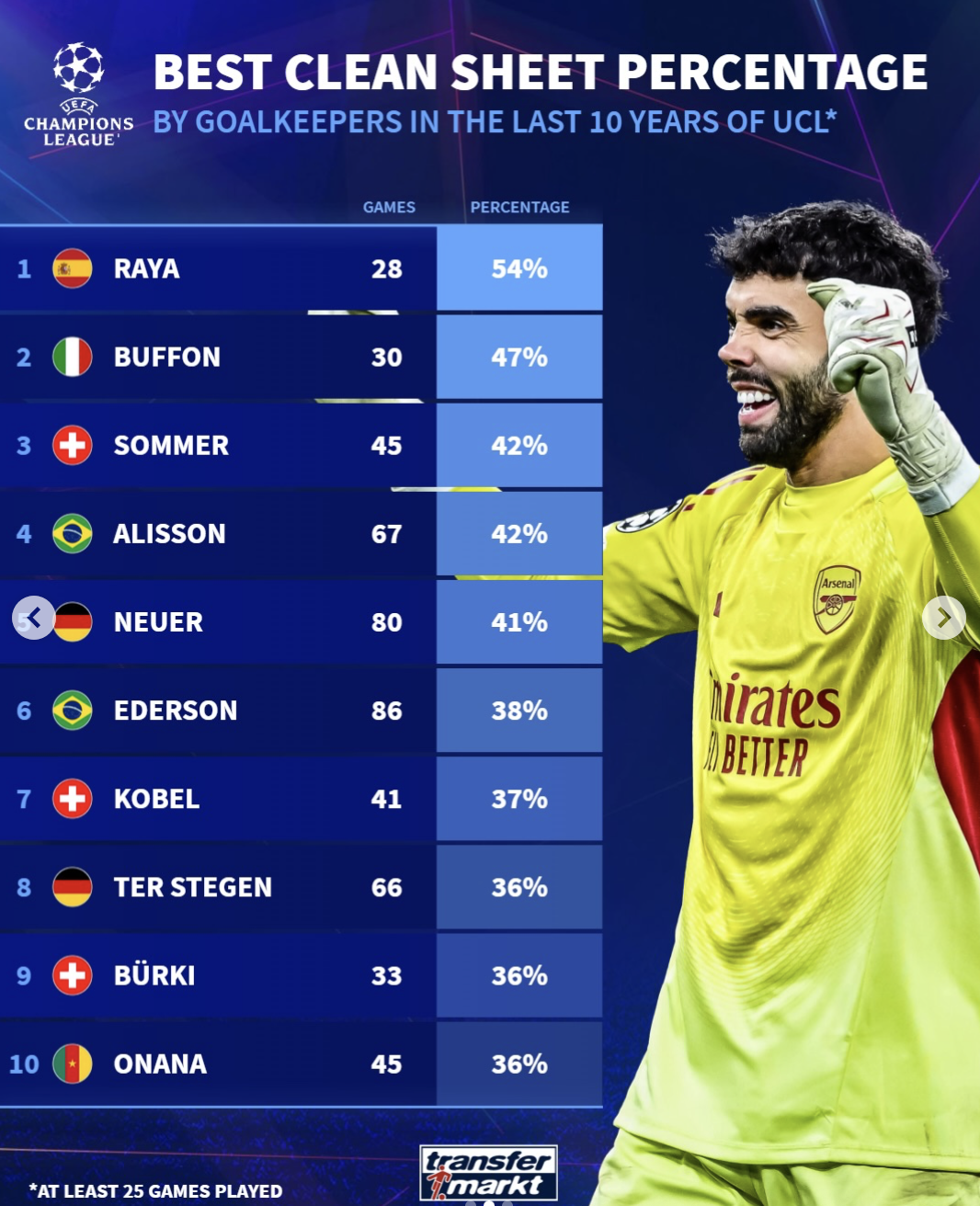 拉亚以54%的零封率居首;布冯以47%排第二。