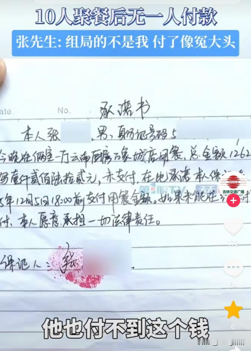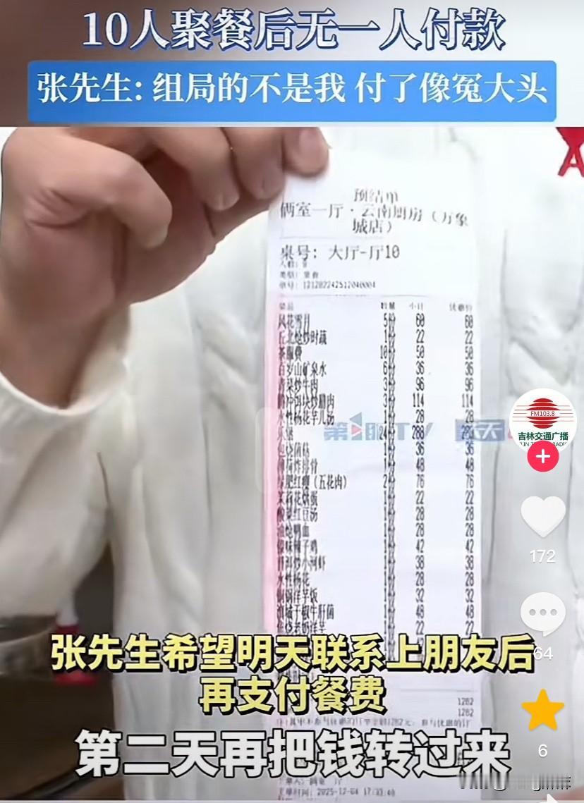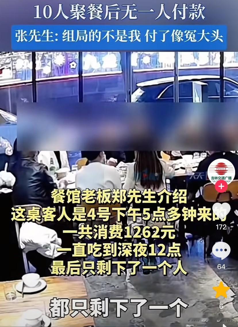 这下出名了,不仅重庆人民知道了,全国人都知道了! 近日,重庆九龙坡一餐馆老板遇到了一件离奇的事,当日下午5点多时,餐馆来了一桌客人,一共10个人有男有女,他们一共消费了1262元,然后10个人从傍晚一直吃到深夜12点,中间谁也不提结账的事。 吃到后来,其他的人陆陆续续都走了,最后只剩下了张先生一个人,张先生对餐馆服务员说:“是别人请他来吃饭的,他不是组局者,他现在身上没有钱,能不能先加个联系方式,等第二天再把钱给转过来。” 服务员将情况告诉了老板,老板一听没有同意,这不是想吃霸王餐吗?哪有吃了饭第二天给钱的道理,第二天你要是不给,人家餐馆去哪找你啊? 最后,餐馆报了警,民警来了之后给组局者打了电话,组局者接了电话后,说自己身上也没有钱,需要去找别人筹钱,后来再给他打电话时他就关机了,打一起吃饭的其他几个人的电话,也都是不接。 经过民警调解,张先生写了一份承诺书,承诺第二天把钱钱送过来,并且还押下了自己的身份证。本以为事情到这里就结束了,但是没想到第二天张先生不但没把钱送过来,并且他还反悔了。 张先生说组局的不是他,买单也不应该是他来买,如果他把这个钱付了,那自己不就成了冤大头了,张先生说他现在只能联系那个组局者,让其尽快来把钱付了。 不得不说,事件中这吃饭的这10个人真是太丢人了,10个成年人凑不出来1200块钱,吃完饭了拍拍屁股都走了,都不愿意付钱,既然没钱那还出来吃什么饭啊? 这个张先生也是,平时难道不清楚这些朋友为人吗?吃完都溜了,留下他自己当冤大头,这是什么样的朋友啊?一千块钱看清了这帮人的真面,跟这些所谓的朋友还是趁早绝交吧!