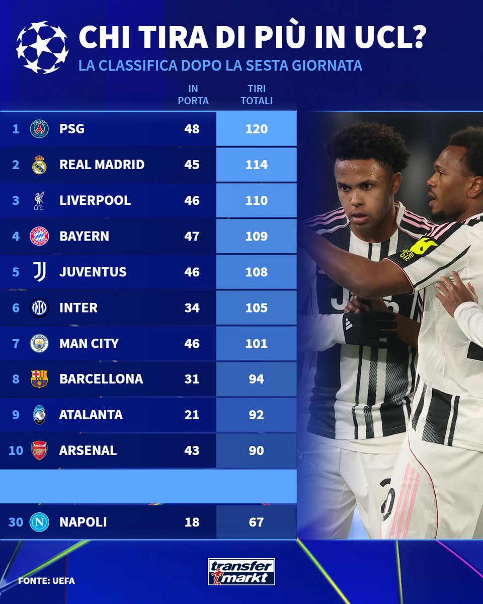 虎扑12月11日讯德国转会市场盘点了本赛季欧冠联赛射门次数最多的球队,排名前十的球队如下: