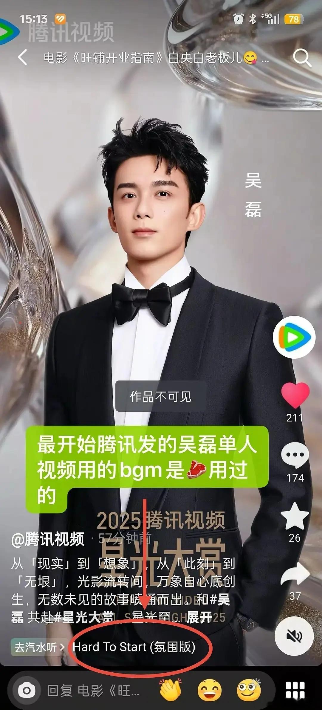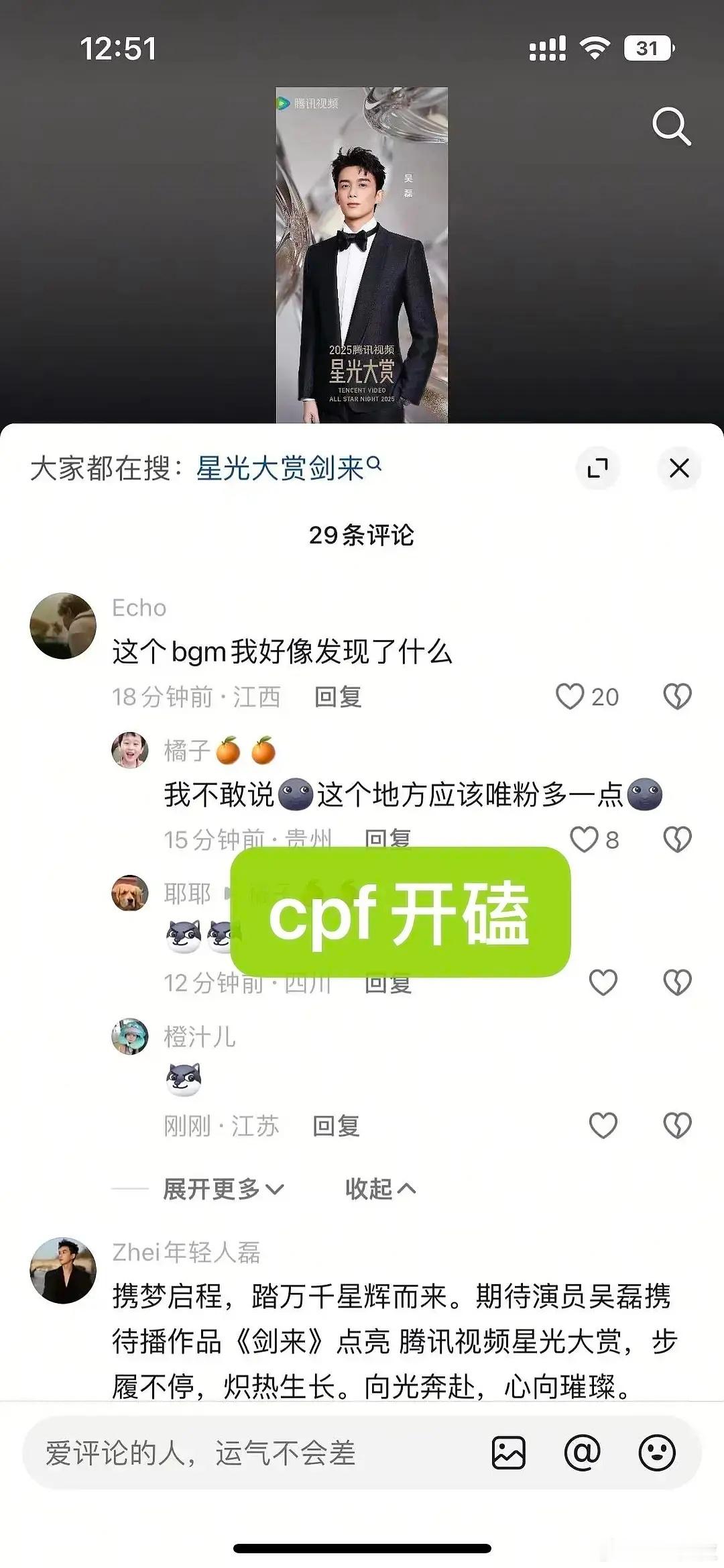 今天星光大赏腾讯发的吴磊单人帖用的bgm是赵露思用过的 于是cpf开嗑 接着官方就删掉换bgm重发了🤣