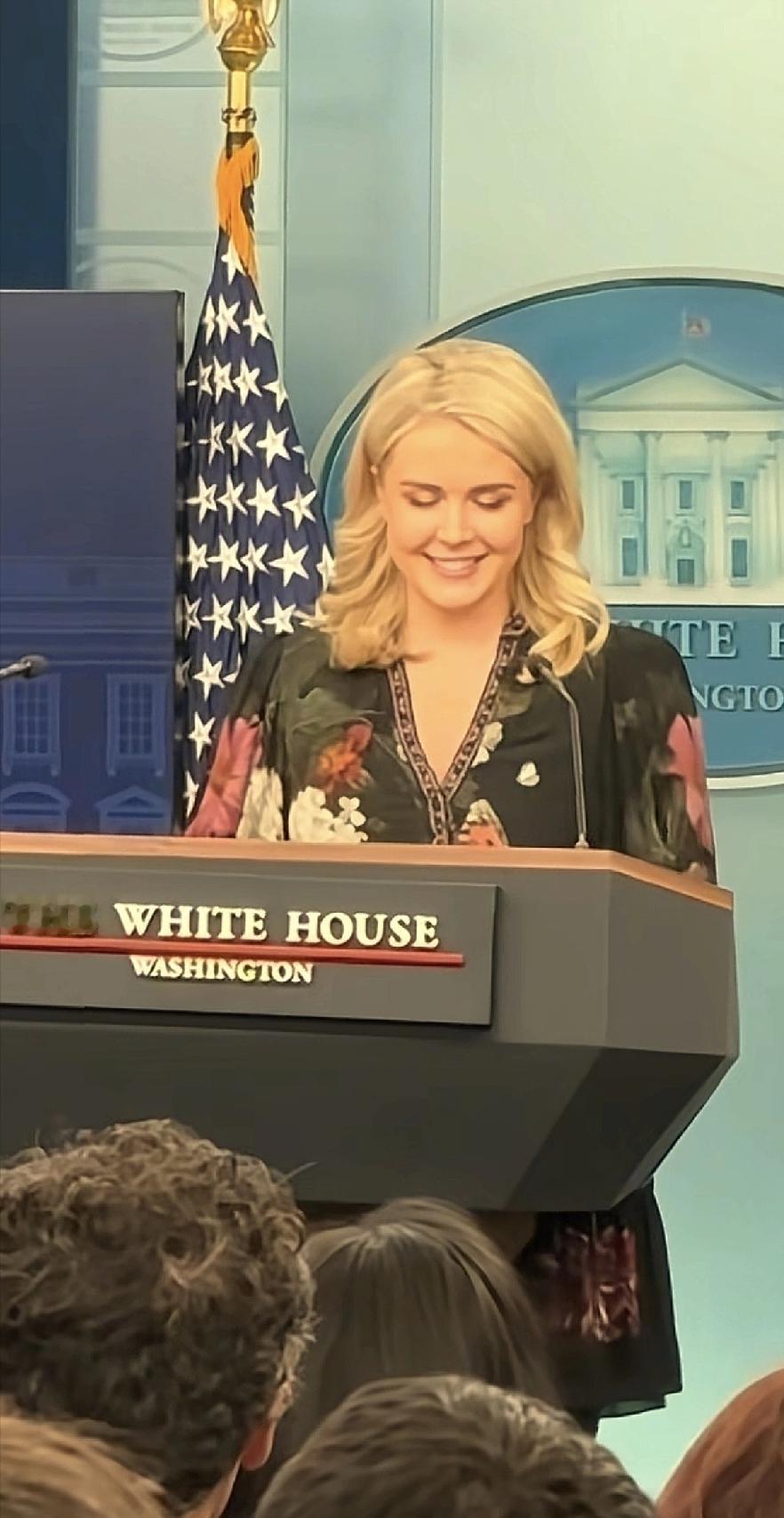 特朗普的嘴像抹了蜂蜜一样甜,把白宫发言人卡罗琳都夸害羞了,特朗普说卡罗琳的脸蛋很