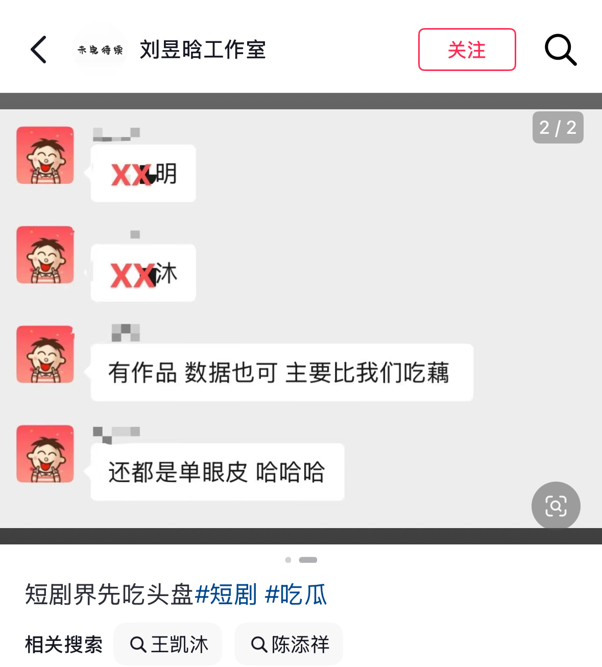 刘昱晗工作室晒聊天记录刘昱晗工作室 看清艺人真面目?啥情况这是……刘昱晗工作室直接用大号下场锤艺人本人吗???🙉🙉🙉工作室账号直接发了聊天记录“小丑娃也不知道怎么就是被大家认可了。”“有作品数据也可,主要是比我们吃藕”还疑似点名王凯沐和陈添祥简介还改成了:看清艺人真面目ps:刘昱晗演过《终极笔记》里的解雨臣,还出演了《暗河传》《水龙吟》(p5)最近跑去演了短剧