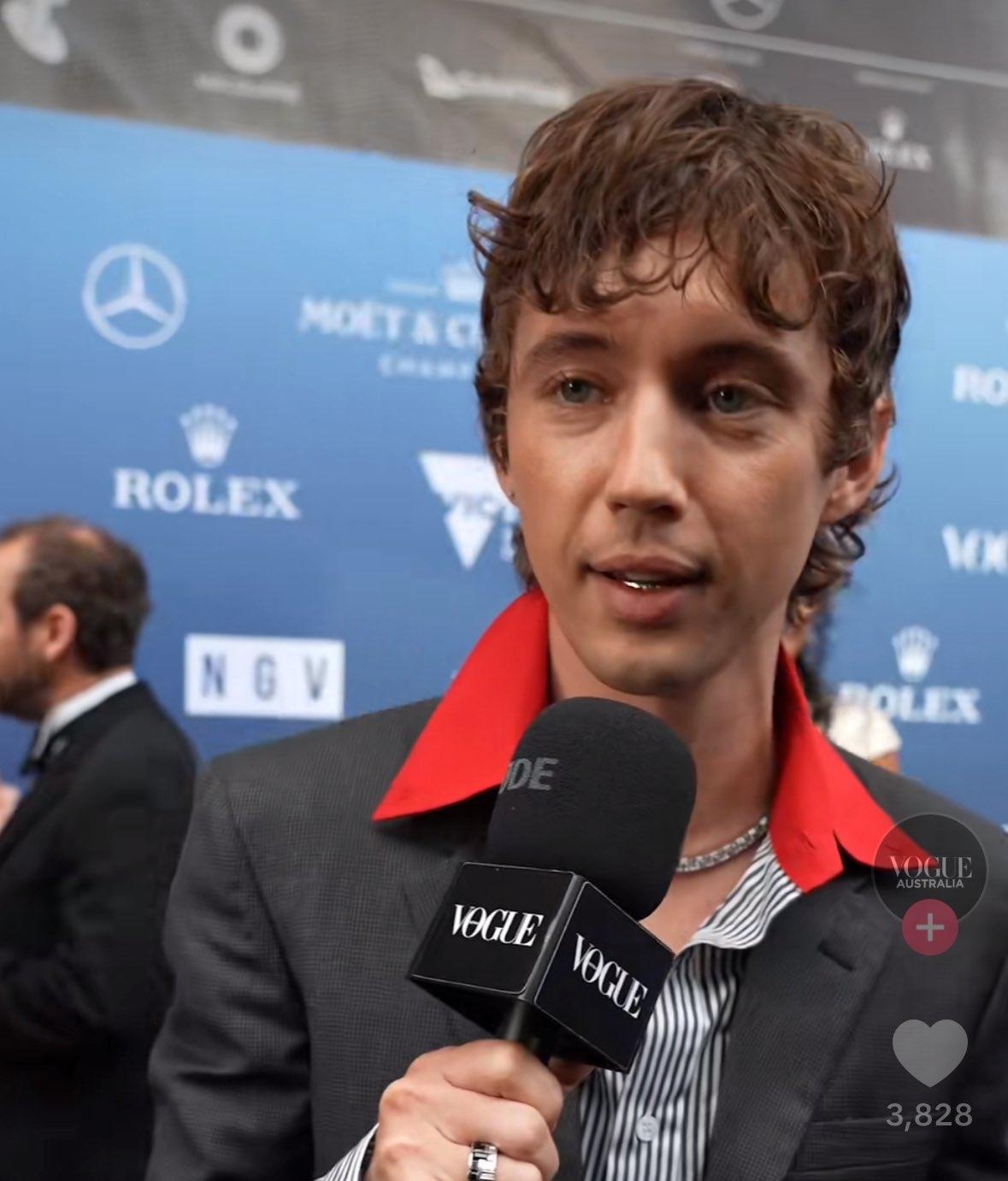 Troye Sivan,于1995年6月5日出生,今年30岁,是澳大利亚流行歌手兼演员,凭借可爱风格闻名全球。在《Vogue》时尚活动现场,他接受采访时被媒体捕捉到“最真实的一刻”:身着灰色西装外套,内搭红色翻领衬衫与白色条纹衬衣,领口微微敞开,露出银色项链,卷发随意散落。他戴着金牙(grillz)微笑,本应自信撩人,却因镜头角度和光线问题,脸部略显浮肿、眼神疲惫,让人“认不出”——标题直接写着“Pop Icon Unrecognizable”,配文还讽刺“从舞台妖精到街头路人”。 粉丝们瞬间炸开了锅,“Leave Troye alone, that's not ugly that's real”的言论刷屏,他们怒斥媒体总是选择最差的角度,媒体的拍摄角度太过分了,戳爷的魅力远不止于完美照片! 《VOGUE》澳大利亚版,这个杂志我记住了,怎么能这么坏啊!
