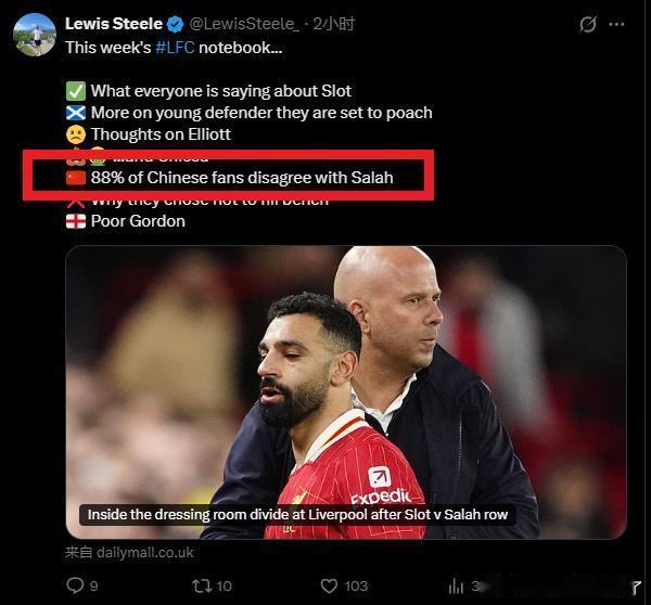 每日邮报斯蒂勒透露一位热衷微博(中国版的X平台)的利物浦铁杆球迷告诉我,一项关于萨拉赫爆炸性采访的投票显示,中国有88%的参与者不认同萨拉赫的行为。