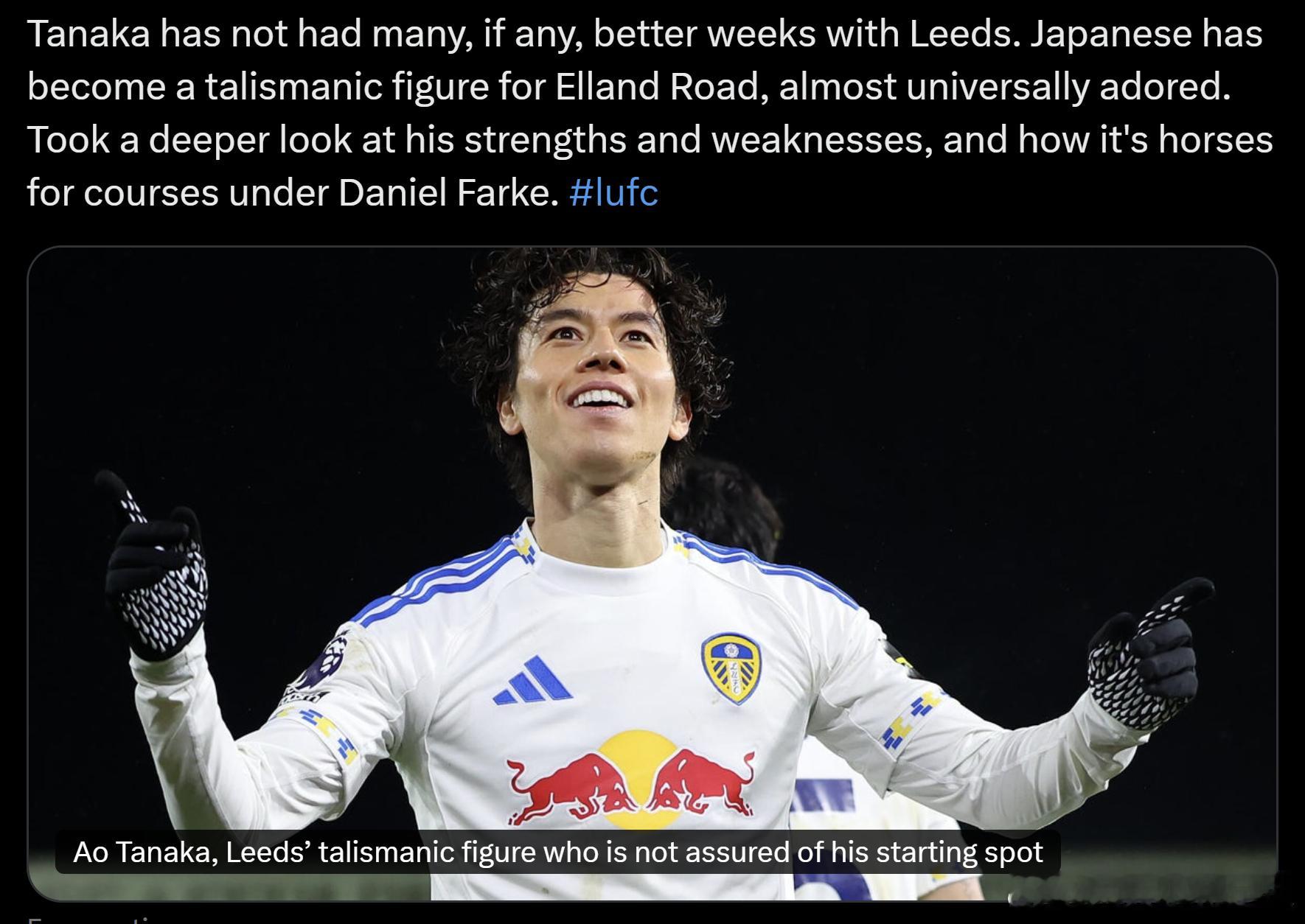 【The Athletic | 田中碧——利兹联那位拥有“图腾”气质、却并非铁打主力的中场核心】节选在主场作战时,当球队需要更多技巧或向前推进球权来撕开防线,田中碧往往能成为打开局面的关键人物。而在客场或主场面对硬仗时,球队可能更需要施塔赫或朗斯塔夫这样的身体对抗型中场。尽管目前田中的出场样本量仍然偏小,但数据清楚显示了他的前进传球(向前至少10码的传球或任何成功送入禁区内的传球)有多重要。在利兹联全队中,没有人能超过他场均4.75次的前进传球。在不含定位球的情况下,他完成进入对方最后三分之一区域的传球数也位居队内前列,场均3.77次,仅次于帕斯卡尔·斯特鲁伊克和安帕杜。不过有趣的是,尽管田中的传球极具前插意识,却很少直接转化为射门或创造机会。他更多是提供“助攻前的助攻”或倒数第二传。全队有7名球员的场均关键传球(能直接威胁球门的传球)高于他的0.82次。无球状态下,法尔克可能有所顾虑的一个明显短板是田中的抢断成功率——仅为29.4%。他场均尝试2.79次抢断,但成功次数只有0.82次。利兹联队内场均丢失对抗次数最多的正是田中(1.97次),不过朗斯塔夫1.94次紧随其后。田中真正令人印象深刻的是拦截和断球回收能力。队内场均拦截次数(1.97次)只有样本更少的詹姆斯·贾斯汀能超过他,而场均断球回收次数(5.08次)也仅逊于贾斯汀和安帕杜。虽然数据表明田中的抢断还有提升空间,但无人怀疑他敢于下脚、敢于对抗的决心。最近最经典的一幕,莫过于他对着切尔西的马洛·古斯托那记势大力沉的飞铲——正是这次抢断造就了卢卡斯·恩梅查的进球(尽管最终被判无效)。斯特鲁伊克先在切尔西半场深处完成了一次让全场沸腾的拼抢,随后田中碧又与古斯托争抢一个50-50球,他干净地赢得球权,直接把埃兰路看台掀翻。博格尔最终送出传中,恩梅查的进球虽被边裁示意无效,但这正是利兹联希望在中场发动机位置看到的田中碧。另外一场对阿斯顿维拉的比赛还出现了罕见一幕:田中碧在同一场比赛里被换上场又被换下场。他先是接连对沃特金斯和布巴卡尔·卡马拉完成凶狠铲断(因此吃到黄牌),随后维拉反击时他又试图封堵约翰·麦金。主裁判罗伯特·琼斯示意优势,麦金从田中脚下带球突围。法尔克赛后透露,第四官员当时警告他,再有一次幅度过大的铲断,这名中场就可能被红牌罚下。因此主教练只能忍痛将其换下。尽管田中碧在对利物浦比赛补时阶段打进扳平比分的宝贵进球让全队狂欢,但此前对利物浦的第三球失球时,法尔克在场边对他的表现极为愤怒——索博斯洛伊庆祝时,法尔克几乎要冲进场内。法尔克赛后新闻发布会上说:“无球防守时,我们前段时间一直是5-3-2,后来改成4-5-1,始终没有从中路压出去。但第82分钟2-2、情绪最激动的时候,我们突然从中路压上,留出了传球通道,而对手是世界级球队。两脚传球,他们就找到防线间的球员,再一脚直塞致命传中。我很恼火我们在那一刻失去了冷静。”“我没法掩饰,田中那一下压得太靠前,直接把通道打开了。但这也正是我们球队的特点——我们或许不够完美,有时候甚至有点天真,还需要更快适应顶级联赛的强度。”从比赛画面中可以看到,田中碧脱离了法尔克要求的中场五人横排,去压迫柯蒂斯·琼斯,结果被对手简单传球绕开,田中失位,赫拉芬贝赫直接获得大片空当前插。在对切尔西打进那脚世界波之前,田中碧其实还有过几次糟糕的射门尝试: 第3分钟,他接卡尔维特-勒温的横传直接把球踢飞; 第23分钟,和他后来进球位置几乎一样,却把球踢偏了很远; 第41分钟,他接到解围的角球后凌空抽射,皮球软绵绵地弹了两下后,偏出了球门15码。是的,世界波最终还是来了,但之前的几次处理都说明一个问题:田中碧总能跑到好位置,但终结能力亟待提高。田中碧并不完美,正如法尔克反复强调的整支球队都不完美,但他就是能在埃兰路拥有那种“图腾”般的号召力。他既是不可或缺的球员,又因为施塔赫、朗斯塔夫截然不同的风格而必须被纳入轮换体系。具体情况具体分析,即便面对像田中这样来自埃兰路球场的优秀选手也是如此。