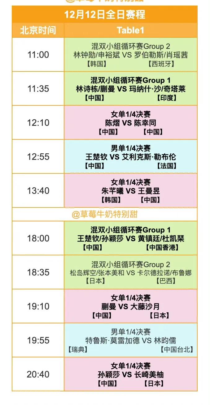 WTT香港总决赛12日的比赛 王楚钦,孙颖莎,蒯曼,都是一天两场,他们的单打对手都是单场,王楚钦先打单打对手是大布,今天看到混双后的王楚钦状态很好,调整过来了有信心对大布,蒯曼,莎莎都是先混双后单打会辛苦些,相信她们能调整好一定会没问题。为他们加油加油。