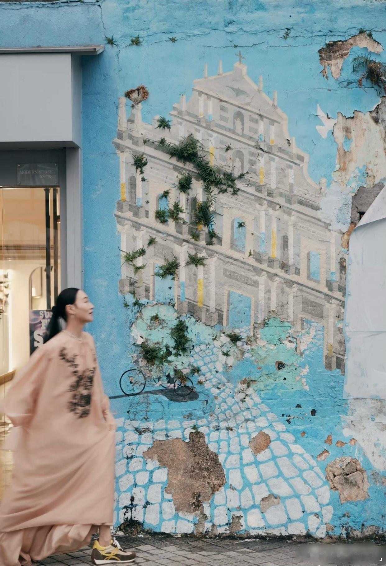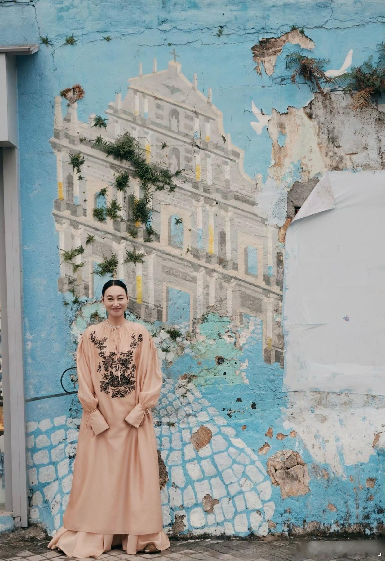 惠英红打卡澳门街头,身穿宽松连衣裙,明媚又温柔。镜头前是光鲜亮丽的明星,镜头外竟然穿了一双舒适的运动鞋。