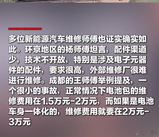 新能源车为啥修起来这么贵?很大一个原因是,集成度太高了。以前油车撞了前后杠,钣喷一下就行了,大不了换一套新的,也没太多钱。但要是现在的电车,前后杠里全是传感器,再往里的话电气设备更多,如果是结构件,还是一体压铸的,那就没法修了,只能换,这就造成了零整比极高。而且,现在的路边店也没法修新能源车了,已经不是简简单单换几个零件就能解决的了。像是EV受限、雷达失灵的问题,路边店怎么修?不可能的,只能找官方维保,以至于说,厂家赚的就是这个钱,卖车赚1分,修车赚1块,这也算是公开的秘密。新能源车为何修不起新能源车维修成本是燃油车2倍多