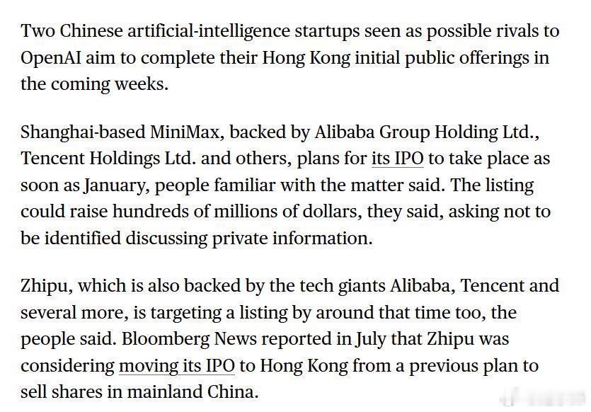 彭博:知情人士透露,获阿里巴巴集团、腾讯控股等公司投资的上海初创企业MiniMax计划最早于明年1月上市。他们称,此次IPO可能筹集数亿美元资金。知情人士还表示,同样获得阿里巴巴、腾讯等科技巨头投资的智谱AI也计划于同期上市。