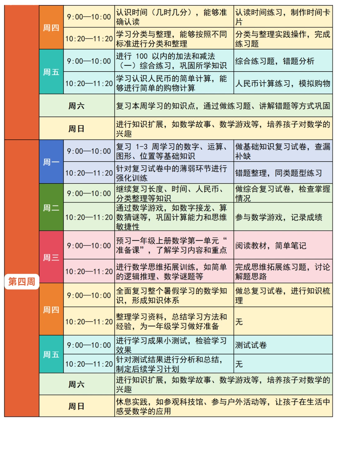📌第四周,进行全面复习和预习,为一年级的学习做好充分准备。