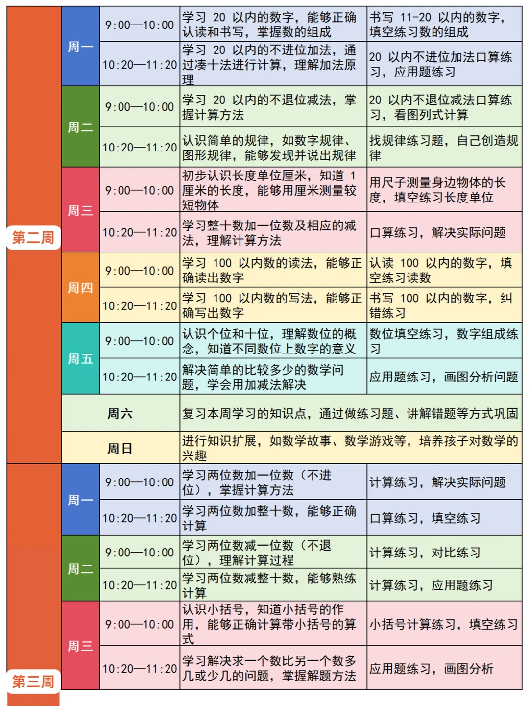 📌第二周,拓展到 20 以内的数字,掌握 20 以内的不进位加法和不退位减法,认识简单规律。