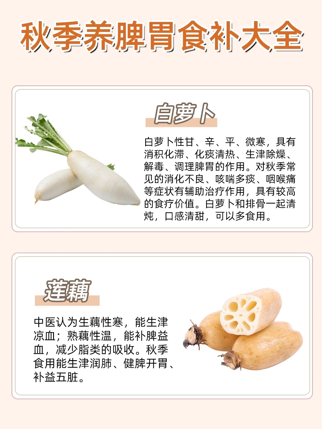 白萝卜性甘、辛、平、微寒,具有消积化滞、化痰清热、生津除燥、解毒、调理脾胃的作用。对秋季常见的消化不良、咳喘多痰、咽喉痛等症状有辅助治疗作用,具有较高的食疗价值。
