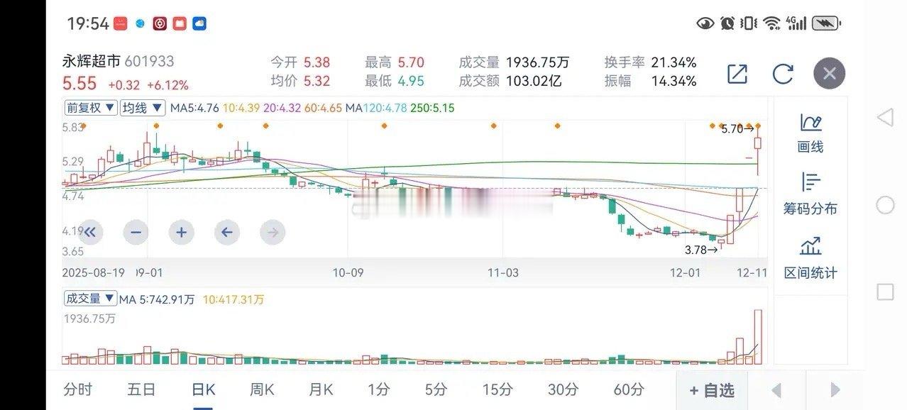 永辉超市:三板巨量要调整!12月11日,永辉超市高开低走,震荡下行,尾盘突然拉升!一直跟踪,简单分析一下:1.整体结构第一波底部2.08-7.87,回调一年见底。2.第二波三板起涨,放出巨量。3.左峰量柱比今天量柱低,。主力要震荡洗盘,洗盘到位,将会拉升。现在,大盘环境不好,看主力洗盘动作吧。不能着急,耐心观察等待。日周月季度线图,趋势向上,预判震荡上行。仅仅作技术分析,不为荐股静待市场验证,如有试盘操作,风险自负。若有兴趣,请查阅我的专栏。