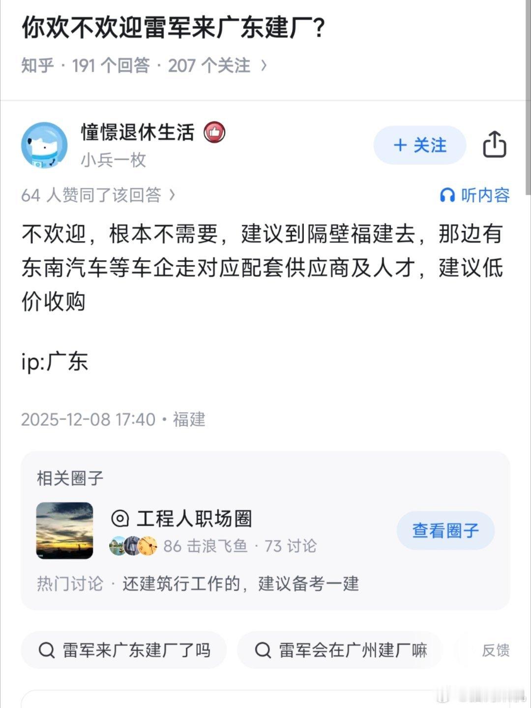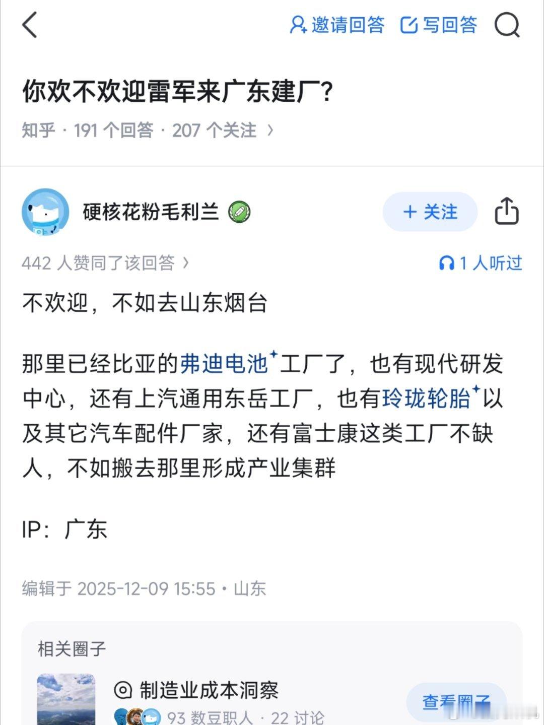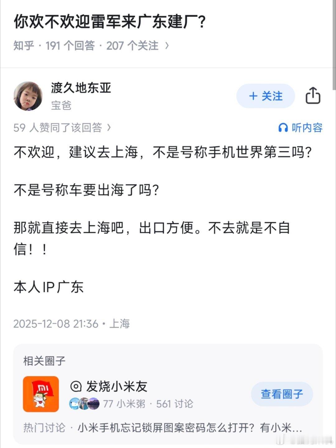 你欢不欢迎雷军来广东建厂?我只能说我们广东不欢迎,要去就去四川建厂。 ip:广东