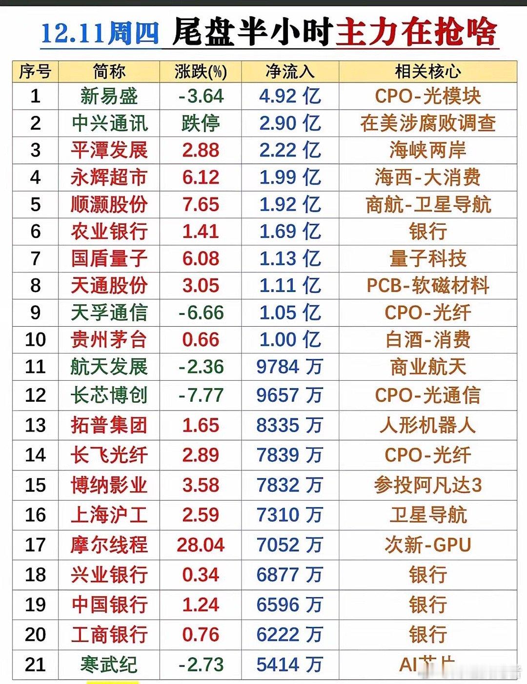 12月11日尾盘资金抢筹榜:科技进攻+银行消费防御核心抢筹标的(按净流入规模排序)1. 新易盛(CPO-光模块):净流入4.92亿,股价跌3.64%,资金借回调抄底算力基建核心标的;2. 中兴通讯(通信):净流入2.90亿,股价跌停(涉美调查),主力博弈事件落地后修复;3. 平潭发展(海峡两岸):净流入2.22亿,股价涨2.88%,短线蹭地域题材热度;4. 永辉超市(海西+消费):净流入1.99亿,股价涨6.12%,消费复苏+地域属性获资金青睐;5. 顺灏股份(商业航天-卫星导航):净流入1.92亿,股价涨7.65%,蹭主线题材短线布局;6. 农业银行(银行):净流入1.69亿,股价涨1.41%,低估值防御配置;7. 国盾量子(量子科技):净流入1.13亿,股价涨6.08%,挖掘前沿科技稀缺题材;8. 天通股份(PCB-软磁材料):净流入1.11亿,股价涨3.05%,看好电子领域稳定需求;9. 天孚通信(CPO-光纤):净流入1.05亿,股价跌6.66%,抄底算力绑定赛道;10. 贵州茅台(白酒):净流入1.00亿,股价涨0.66%,消费龙头防御配置;11. 其余重点标的:航天发展(商业航天,9784万)、长芯博创(CPO,9657万)、拓普集团(人形机器人,8335万)、摩尔线程(次新+GPU,7052万)、3家银行股(兴业、中行等)同步获防御性资金加仓。资金布局逻辑尾盘资金呈“攻守兼备”特征:科技主线(CPO、商业航天、量子科技)是进攻核心,即便部分标的回调仍遭抄底;银行权重+消费龙头(茅台、永辉)承接避险资金,成防御主力;次新+GPU、事件驱动型标的偶发短线炒作,兼顾成长与稳健。今日看盘上证指数a股
