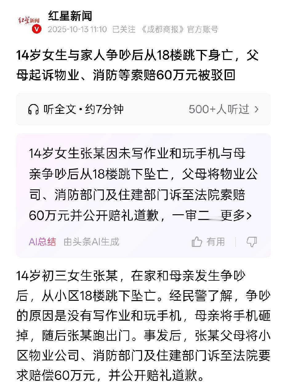 青海,14岁女孩在家玩手机,没有写作业,母亲看到后,跟女孩吵了一架,还将手机摔了,女孩气不过,跑到楼顶上,跳楼身亡。女孩的父母认为物业没有锁住楼顶大门,没设安全警告标志,将物业告上法庭,索赔60万。案子经过一审二审,法院这样判。 事发当日,14岁的女孩张某正窝在房间里玩手机,早已将老师布置的作业抛到了九霄云外。 推门而入的母亲看到这一幕,瞬间怒火中烧,当即厉声斥责女儿。 张某听到母亲没完没了的责骂,她心里很不服气,就顶嘴了几句。 其母亲看到女儿不听话,更是气的火冒三丈,考虑到家中还有个儿子,那姐姐不学好,这不给弟弟带偏了吗,所以说话语气重了点。 两人一句句争执的话语在屋内回荡,矛盾迅速升级。 情绪激动的母亲一把抢过张某手中的手机,狠狠摔在了地上。 随着手机屏幕碎裂的脆响,张某的情绪也彻底崩溃。 她没再和母亲争辩,而是猛地起身,冲出家门,直奔小区居民楼的楼顶。 母亲有些后悔,察觉不对劲的她赶紧让小儿子追出去找。 但一切都晚了。 张某的弟弟在楼顶上发现了姐姐,想要劝告她回家,谁知,张某直接跳下去。 楼下传来了邻居惊呼,张某被紧急送医院救治,但不幸去世。 突如其来的噩耗,让张某父母陷入巨大的悲痛之中。 张某的母亲后悔自己不该摔手机,太简单粗暴了! 如果她设置一下功能每天玩一两个小时手机就可以了。不会设置可以跟孩子说暂时保管一下到时候给她! 说不定悲剧不会发生。 14岁孩子处于叛逆期,她应切实加强教育,不能粗暴处理,会伤害孩子的自尊心,多次教育仍不见效果可请心理医生才是。 可张某后悔也来不及了,一切都晚了。 在整理女儿遗物的日子里,张某夫妇渐渐将悲痛转化为对物业的追责。 他们认为,正是物业没有锁住楼顶大门,也未设置任何安全警示标志,消防也不过关,才给了女儿轻生的可乘之机。 如果物业尽到了管理义务,这场悲剧或许就不会发生。 抱着这样的想法,张某父母将小区物业告上法庭,提出60万元的赔偿诉求。 一审法院审理查明,张某跳楼身亡的直接诱因是与母亲的争吵及自身情绪失控,属于自陷风险的行为。 而楼顶并非对外开放的公共区域,物业虽存在管理疏漏,但该疏漏与张某的死亡之间并不存在直接的因果关系。 《民法典》第1176条规定,对于自身主动实施的危险行为,在不存在他人故意或重大过失的情况下,行为人应自行承担相应后果。 张某跳楼是其在与母亲争吵后情绪失控下的自主行为,属于自陷风险,不应将责任归咎于物业。 一审法院最终作出判决,驳回张某父母的全部诉讼请求。 但,张某夫妇不服,坚持上诉,二审维持原判。 女儿和母亲争吵跑去跳楼致死,是非常悲痛欲绝的事。 但起诉物业公司赔偿,是非常牵强的要求。如果是跳了长江,不是要找长江管理局。试问跳进太平洋,那该找谁呢? 做父母的对孩子管理过于粗暴,导致孩子的逆反心理,应该循循善诱,细心教导,不应该摔孩子的手机,至于孩子跳楼身亡跟物业无关。 对此,你怎么看?